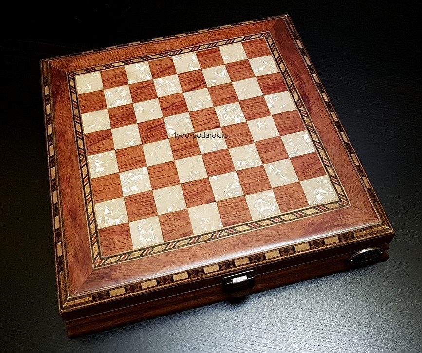 Шахматная доска изготовлена из ореха и украшена инкрустацией из различных пород дерева и перламутра. Поверхность отполирована и покрыта матовым лаком в стиле "антик".
