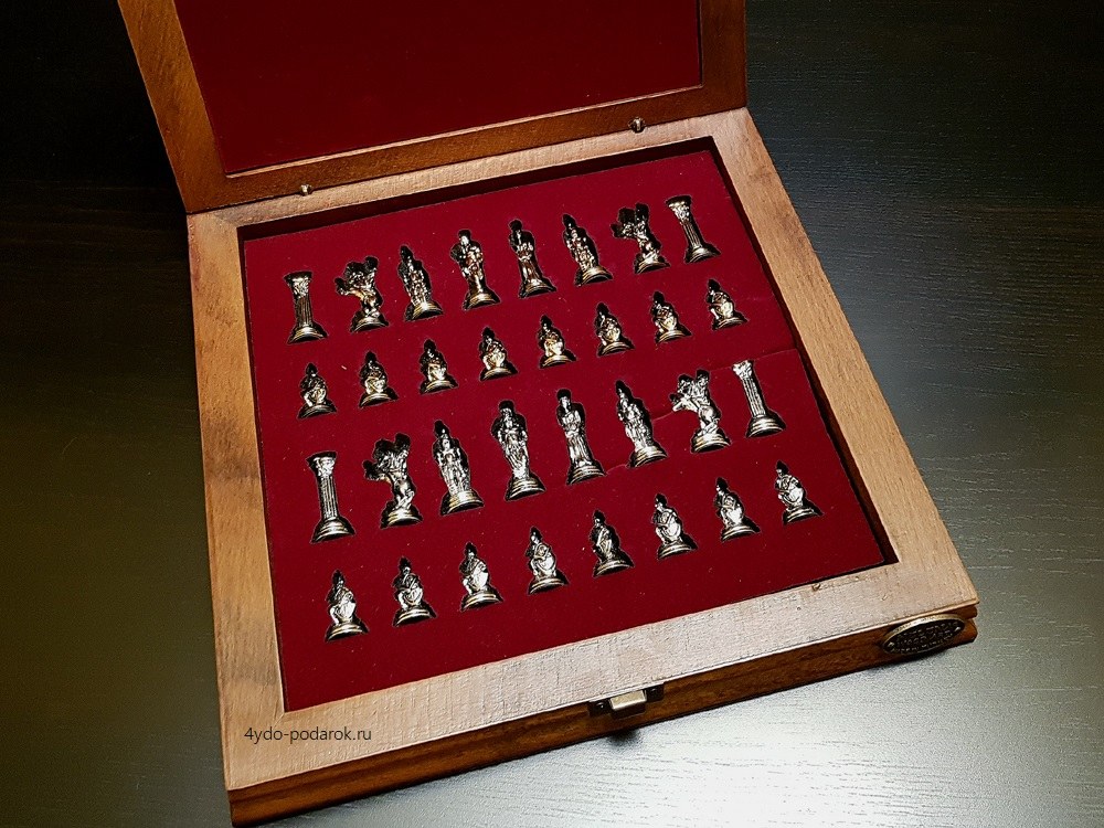 Шахматные фигуры - бронзовые литые, укладываются в индивидуальные ячейки. Фигуры выполнены в античной тематике.