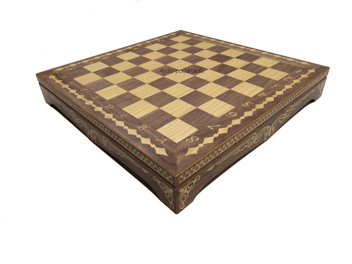 Специфика изготовления и обработки ларца: шахматный ларец изготавливается из ценных пород дерева с применением техники маркетри. Разметка игрового поля и декорирование узорами производится мастером вручную. Ларец оснащён внутренними Итальянскими петлями, конструкция которых позволяет полностью исключить их перегибание и деформацию, что значительно увеличивает срок эксплуатации произведения мастера. Внутри ларца имеются отделения для хранения каждой шахматной фигуры.