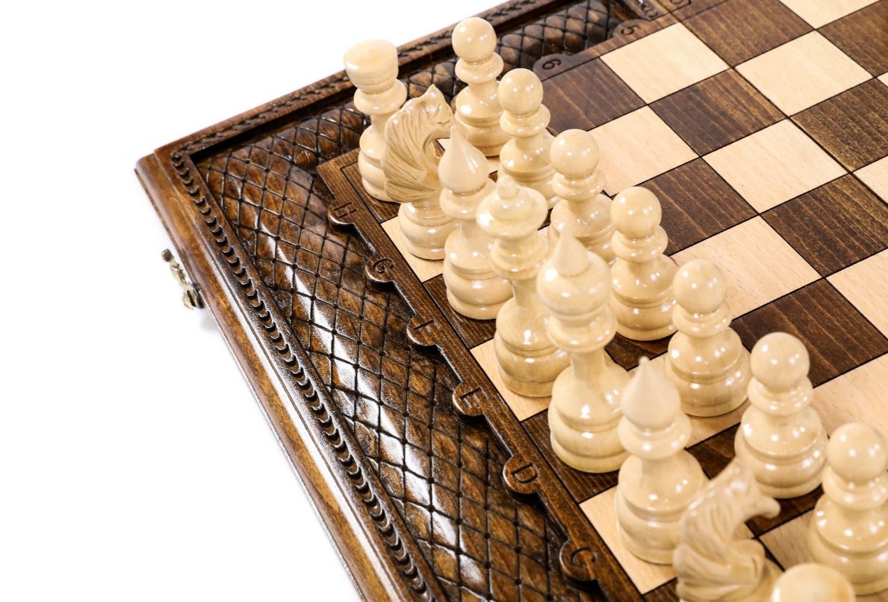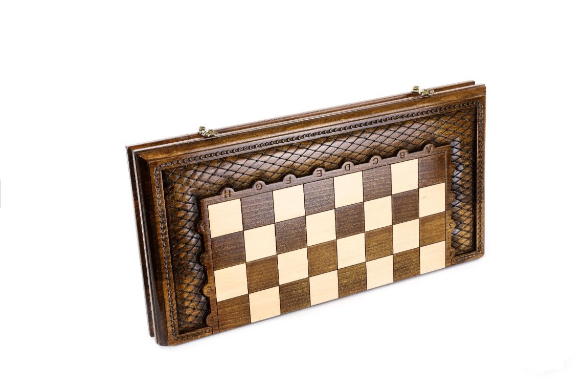 -Игровая доска: техника маркетри + ручная резьба с применением техники объёмной гравировки. Литьё из бронзы (замки и петли)