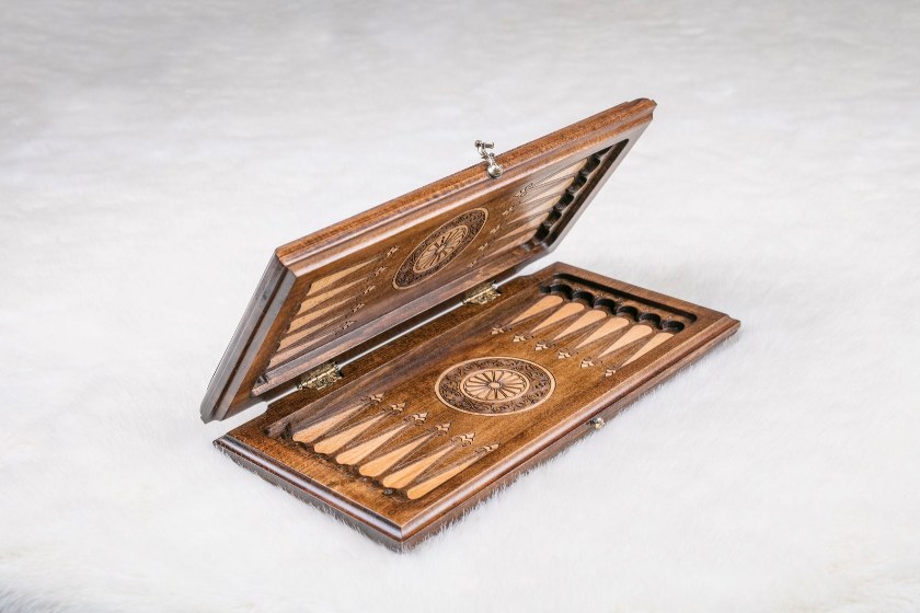 -Игровая доска: техника маркетри + ручная резьба с применением техники объёмной гравировки. Литьё из бронзы (замки и петли)