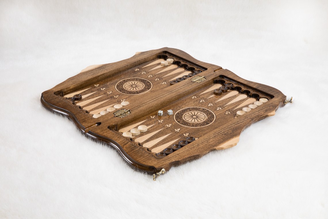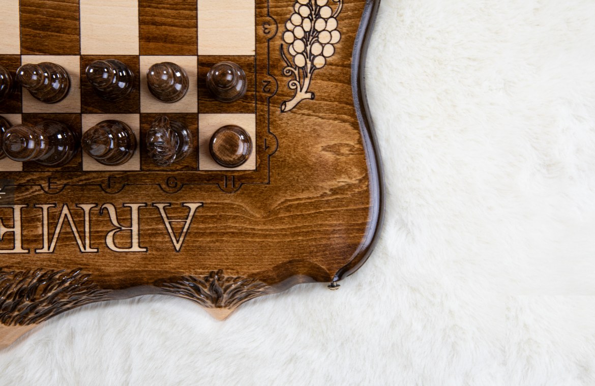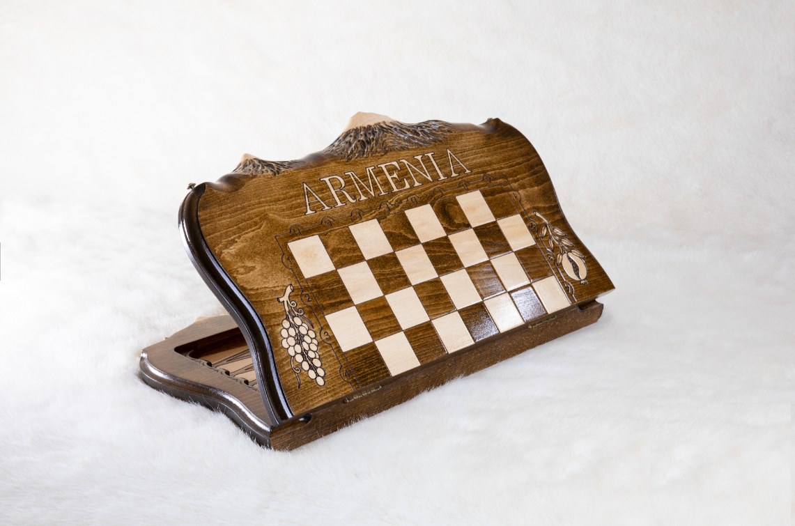 -Игровая доска: техника маркетри + ручная резьба с применением техники объёмной гравировки. Литьё из бронзы (замки и петли)