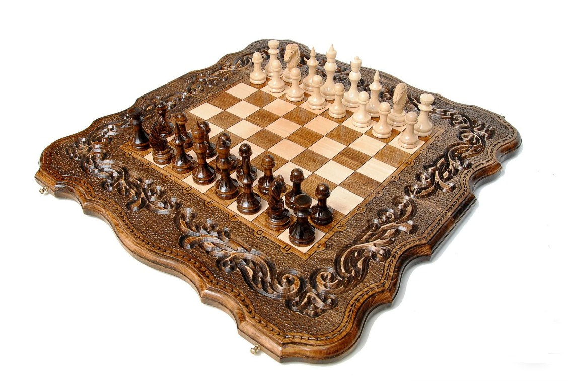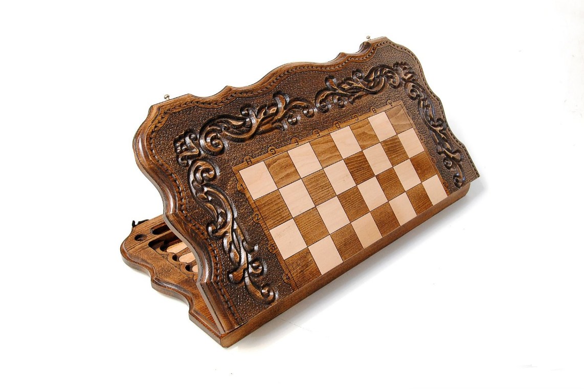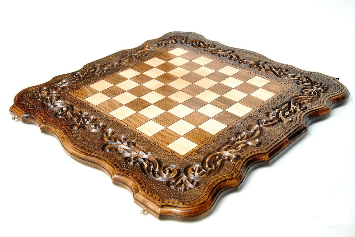 -Игровая доска: техника маркетри + ручная резьба с применением техники объёмной гравировки. Литьё из бронзы (замки и петли)