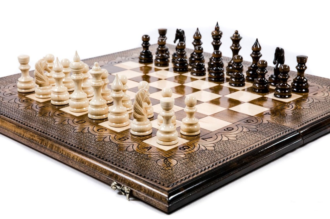 -Игровая доска: техника маркетри + ручная резьба с применением техники объёмной гравировки. Литьё из бронзы (замки и петли)
