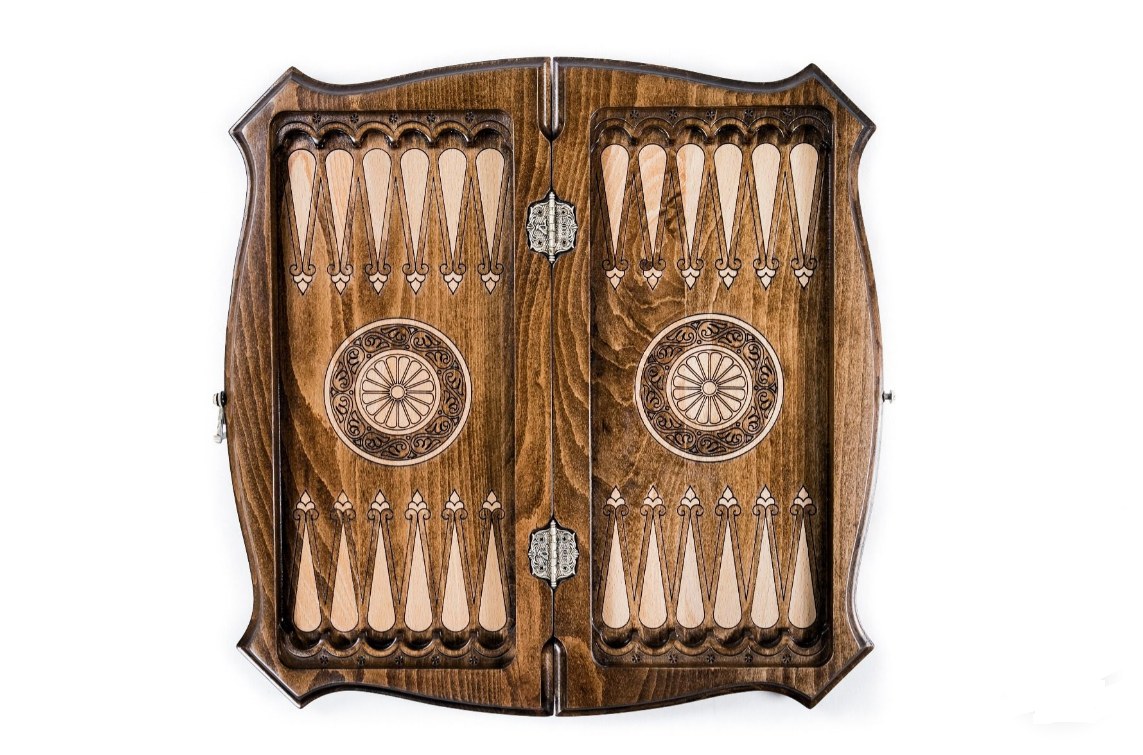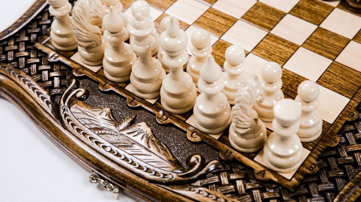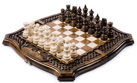 -Игровая доска: техника маркетри + ручная резьба с применением техники объёмной гравировки. Литьё из бронзы (замки и петли)