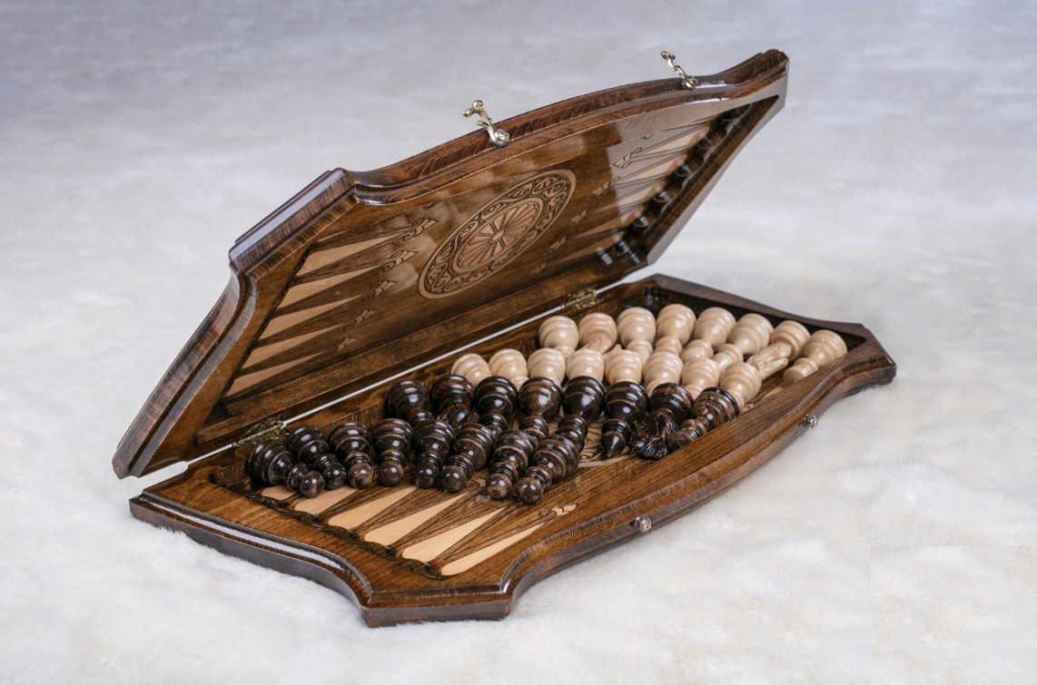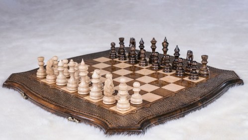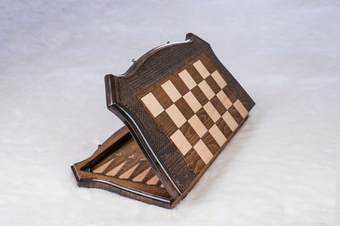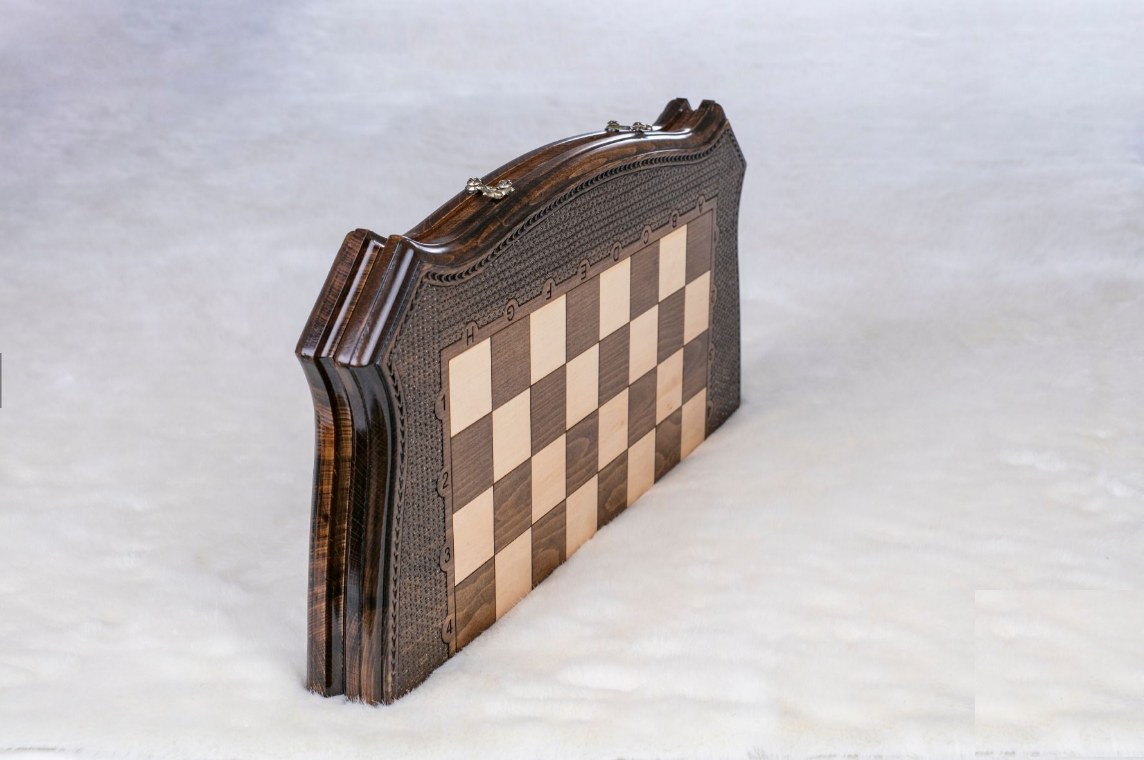 -Игровая доска: техника маркетри + ручная резьба с применением техники объёмной гравировки. Литьё из бронзы (замки и петли)