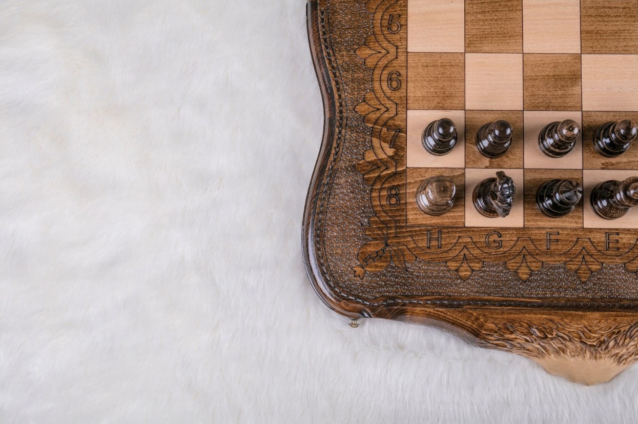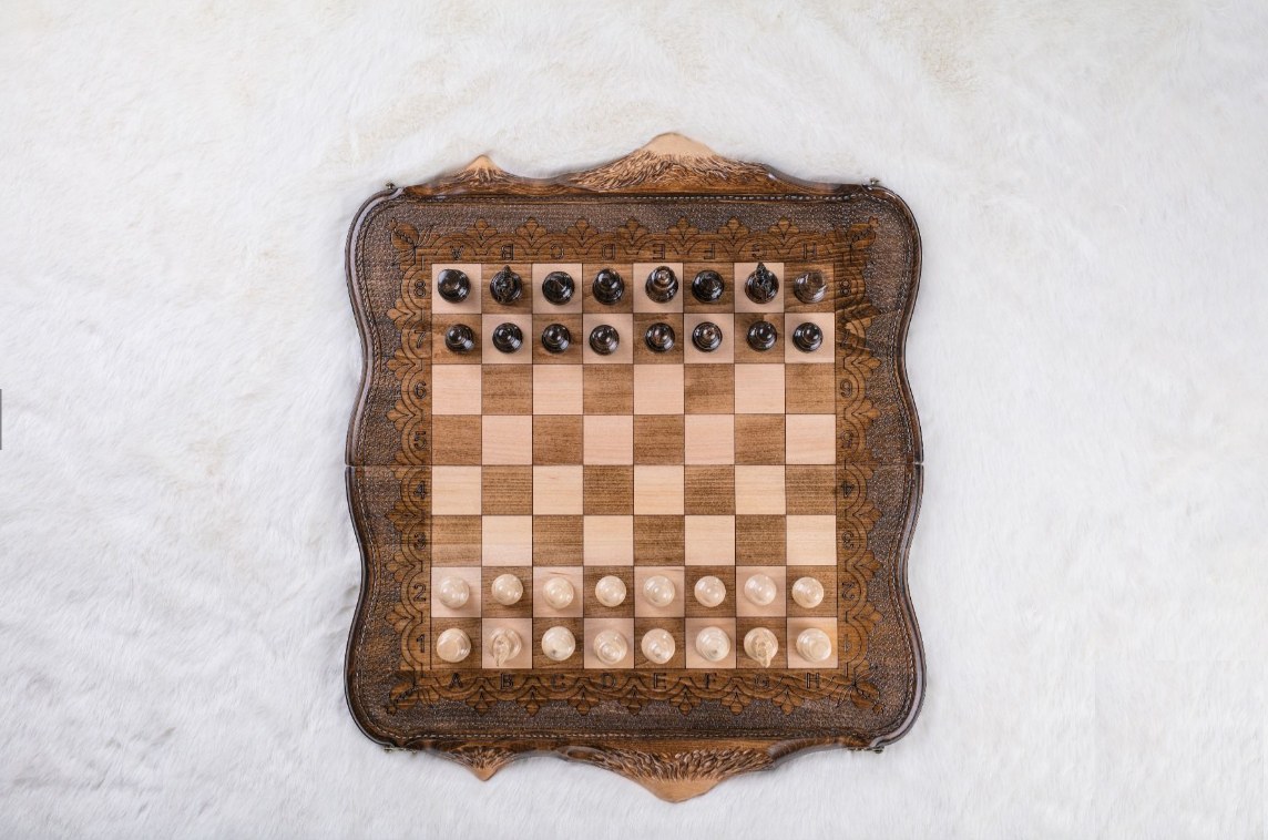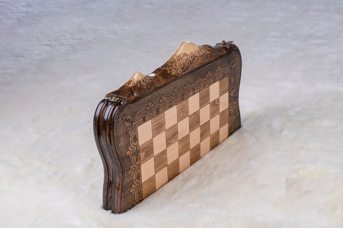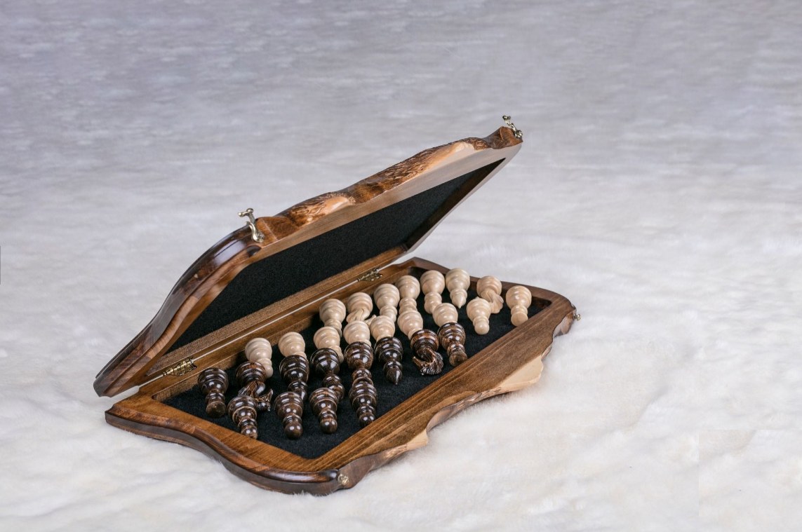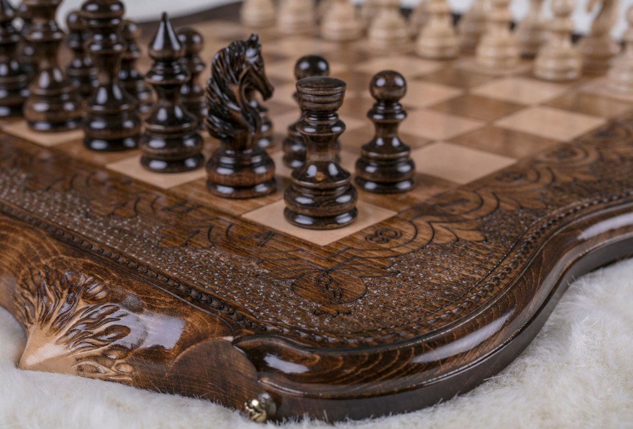 -Игровая доска: техника маркетри + ручная резьба с применением техники объёмной гравировки. Литьё из бронзы (замки и петли)