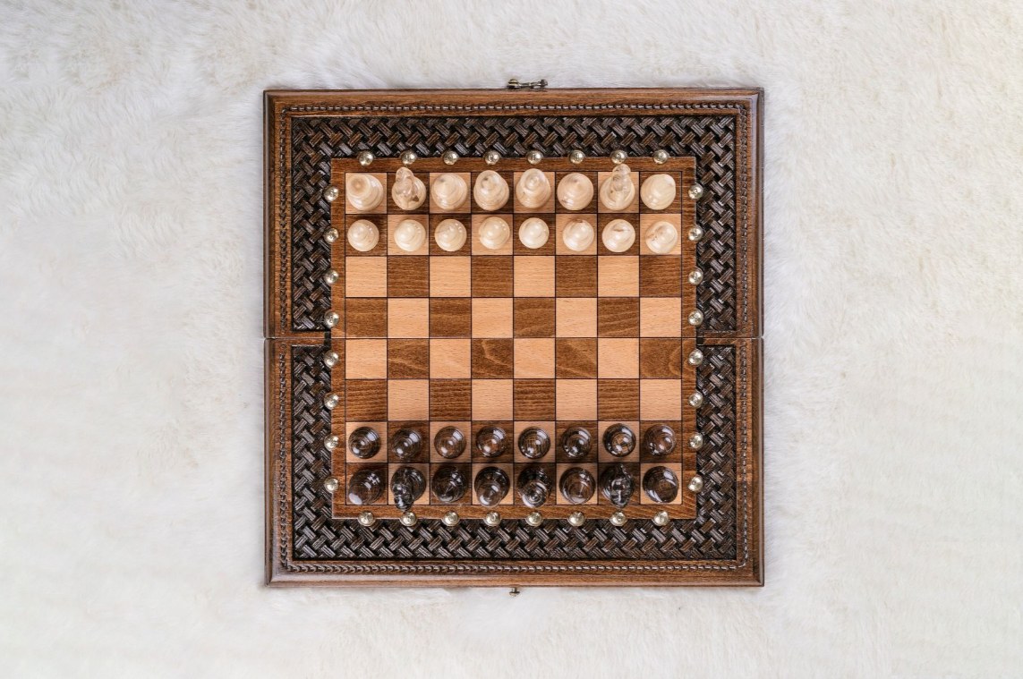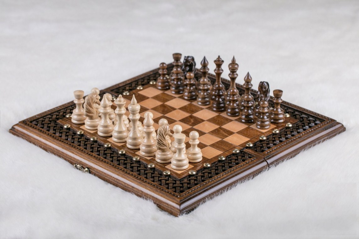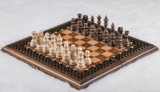 -Игровая доска: техника маркетри + ручная резьба с применением техники объёмной гравировки. Литьё из бронзы (замки и петли)