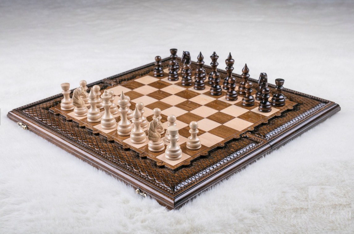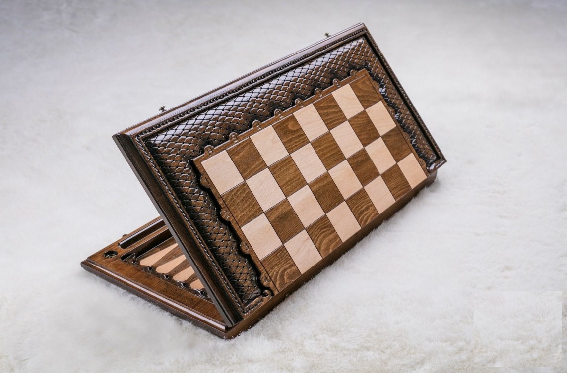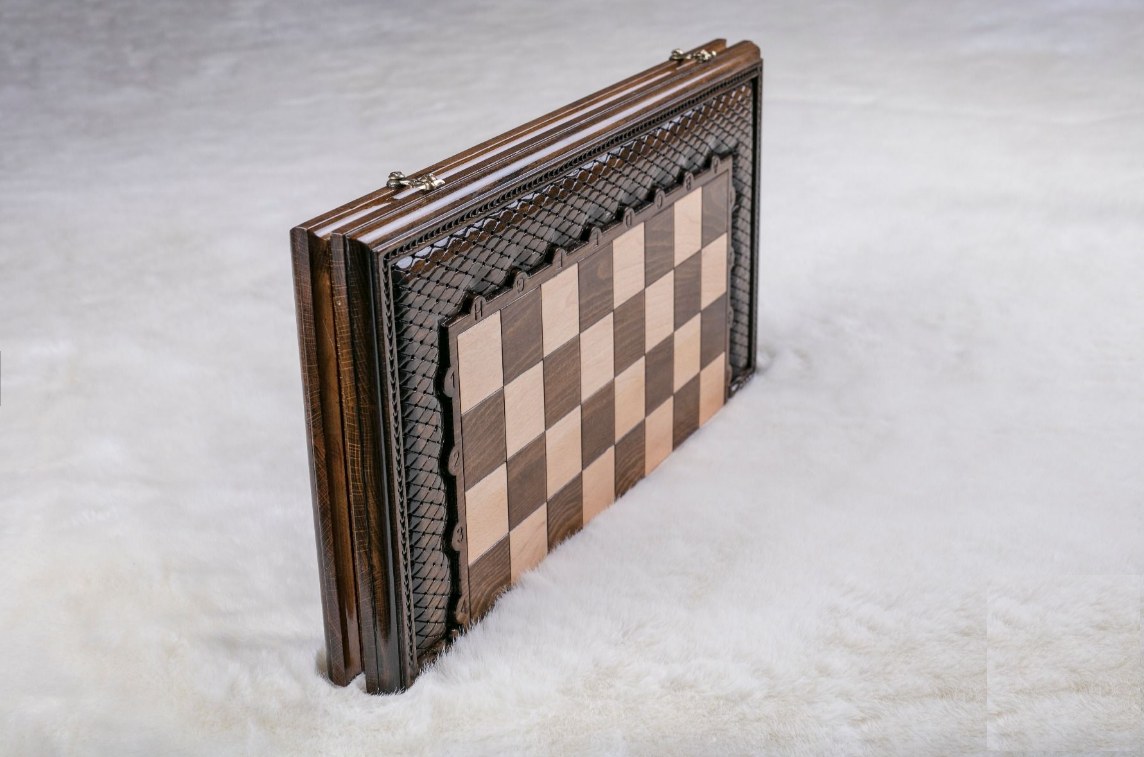 -Игровая доска: техника маркетри + ручная резьба с применением техники объёмной гравировки. Литьё из бронзы (замки и петли)