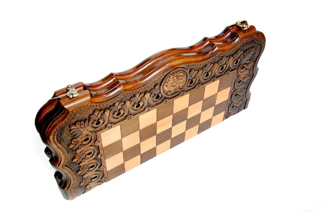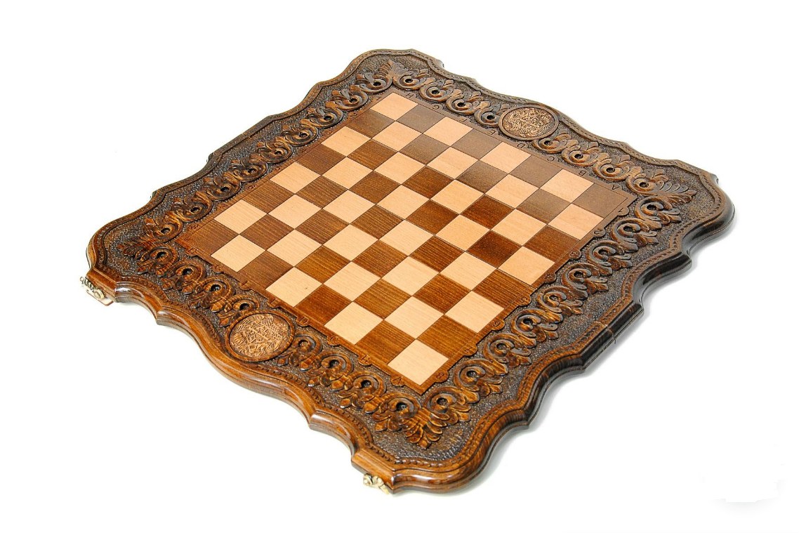 -Игровая доска: техника маркетри + ручная резьба с применением техники объёмной гравировки. Литьё из бронзы (замки и петли)