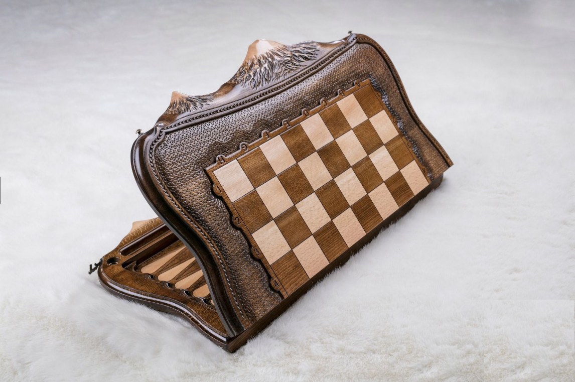 -Игровая доска: техника маркетри + ручная резьба с применением техники объёмной гравировки. Литьё из бронзы (замки и петли)