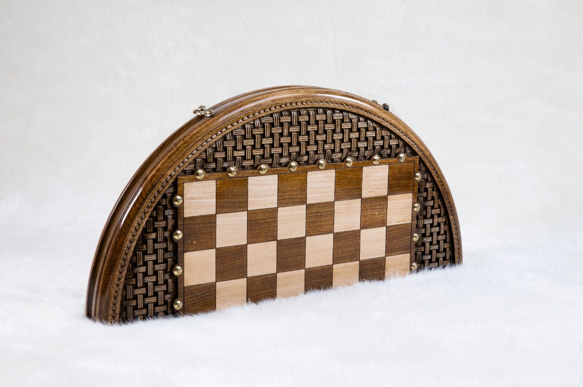 -Игровая доска: техника маркетри + ручная резьба с применением техники объёмной гравировки. Литьё из бронзы (замки и петли)