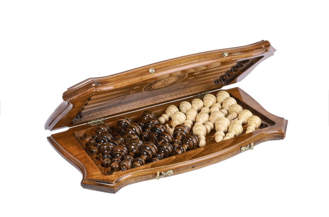 -Игровая доска: техника маркетри + ручная резьба с применением техники объёмной гравировки. Литьё из бронзы (замки и петли)