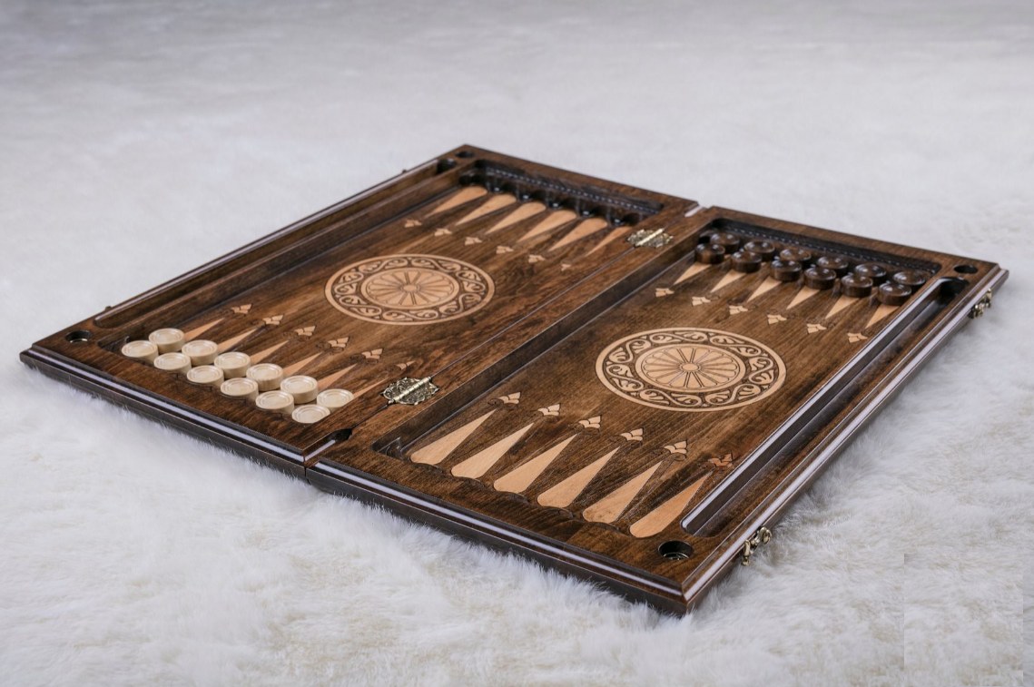 -Игровая доска: техника маркетри + ручная резьба с применением техники объёмной гравировки. Литьё из бронзы (замки и петли)