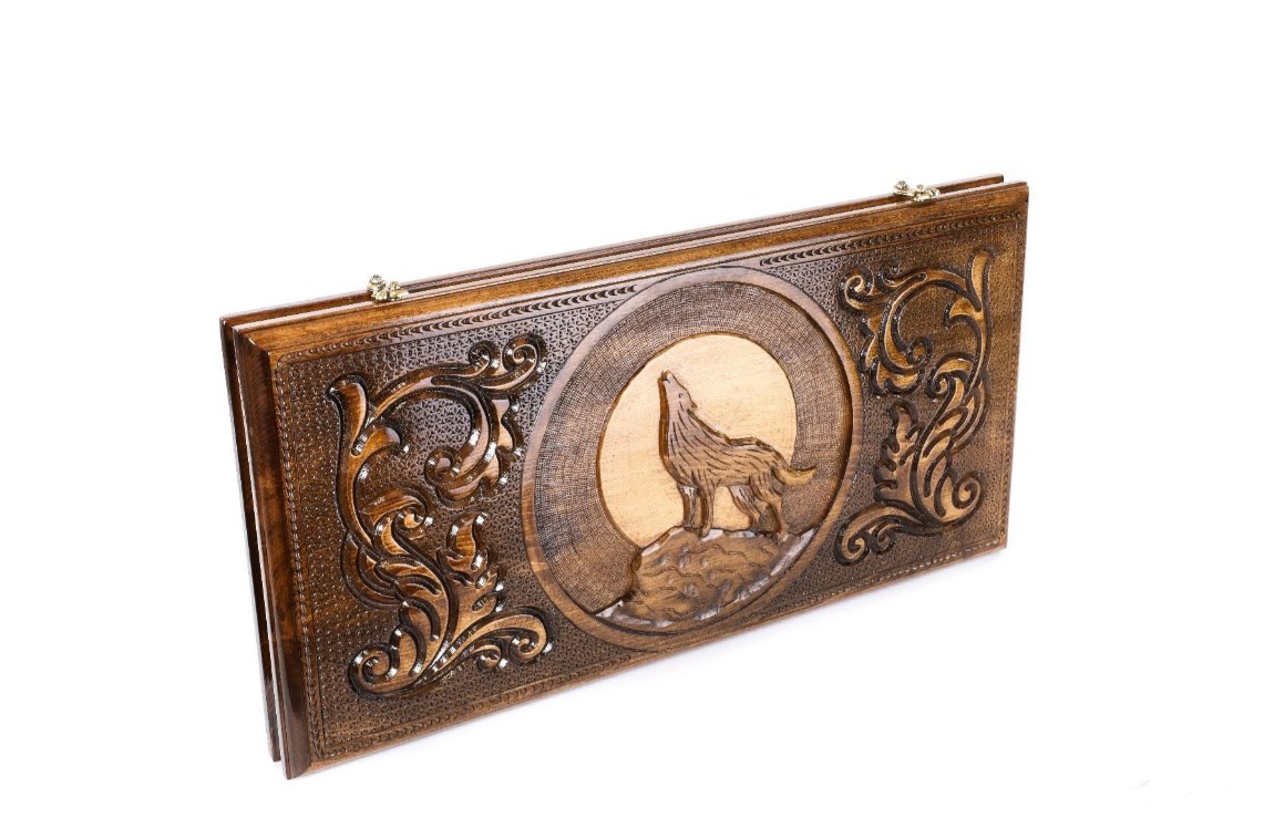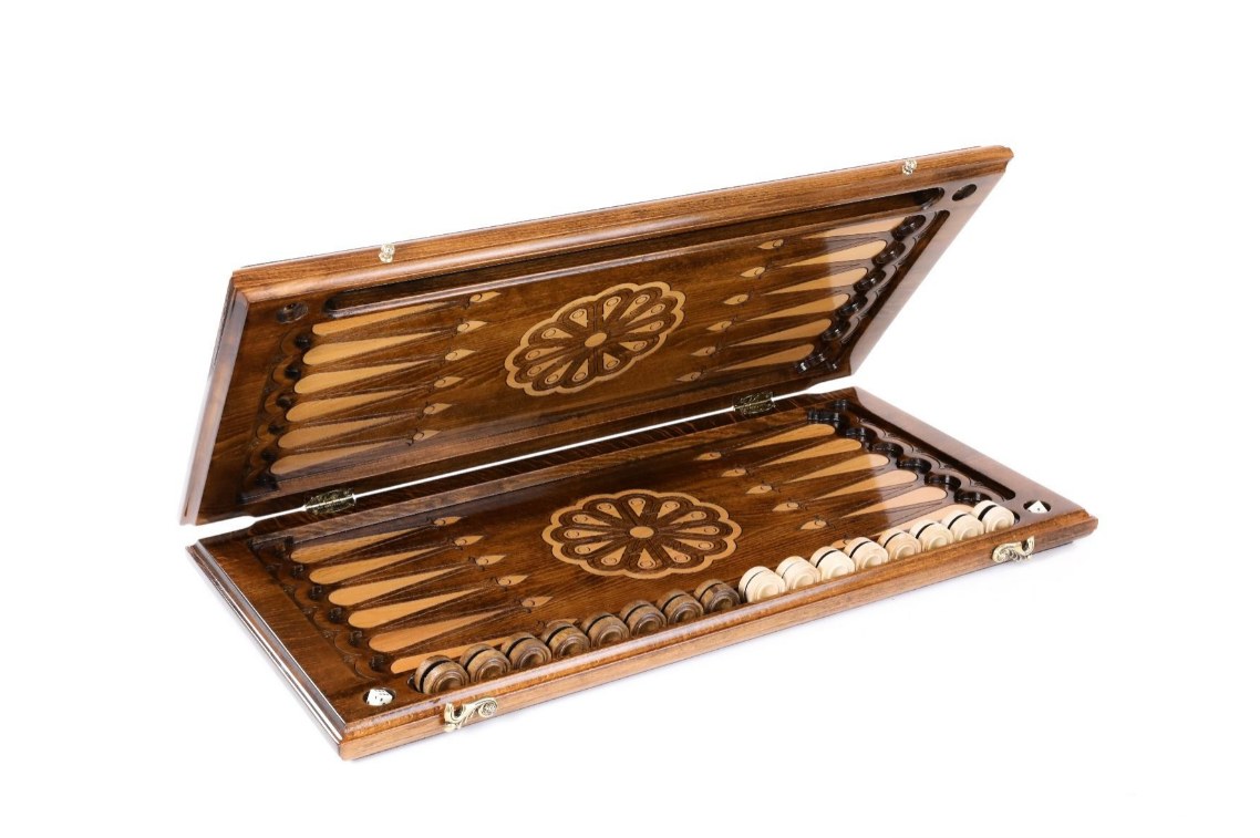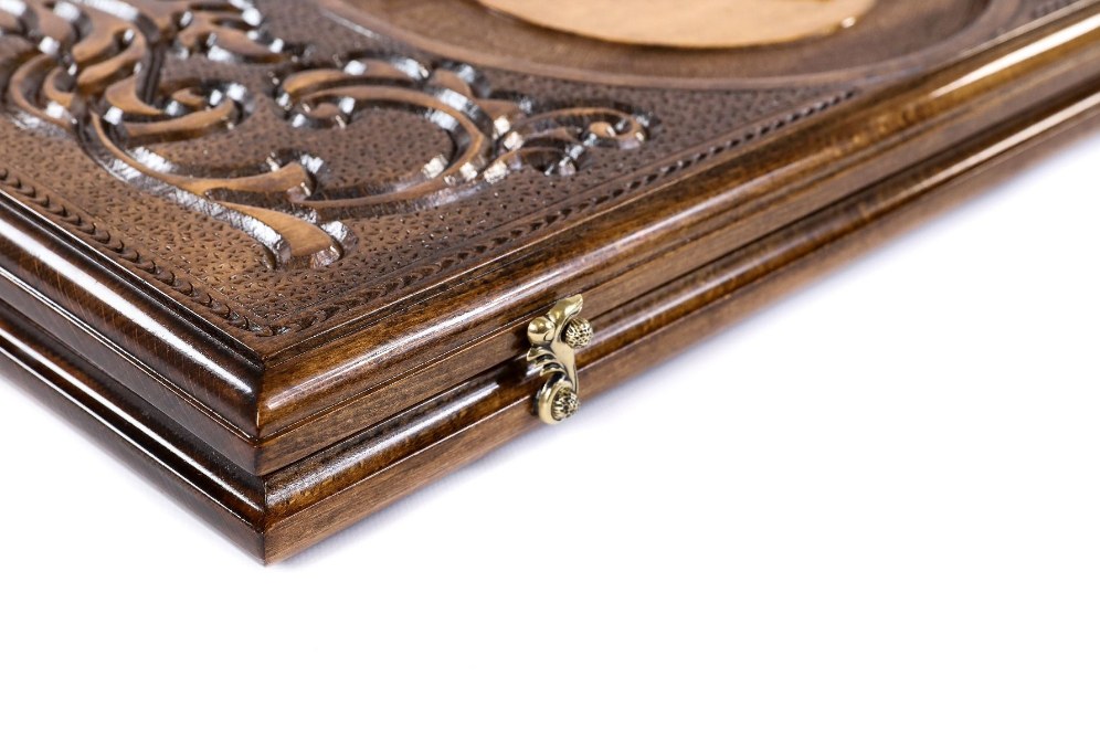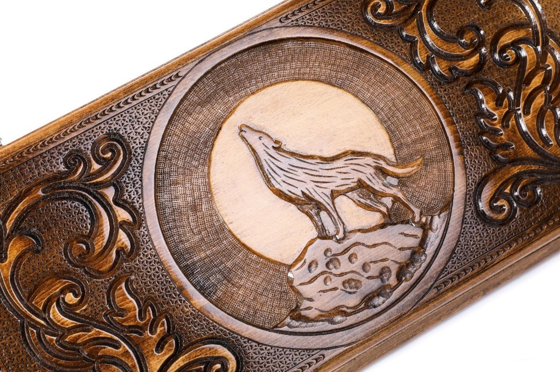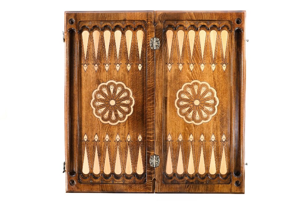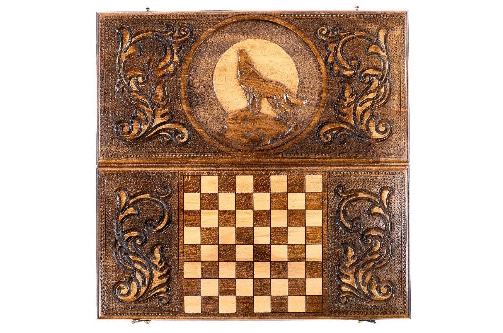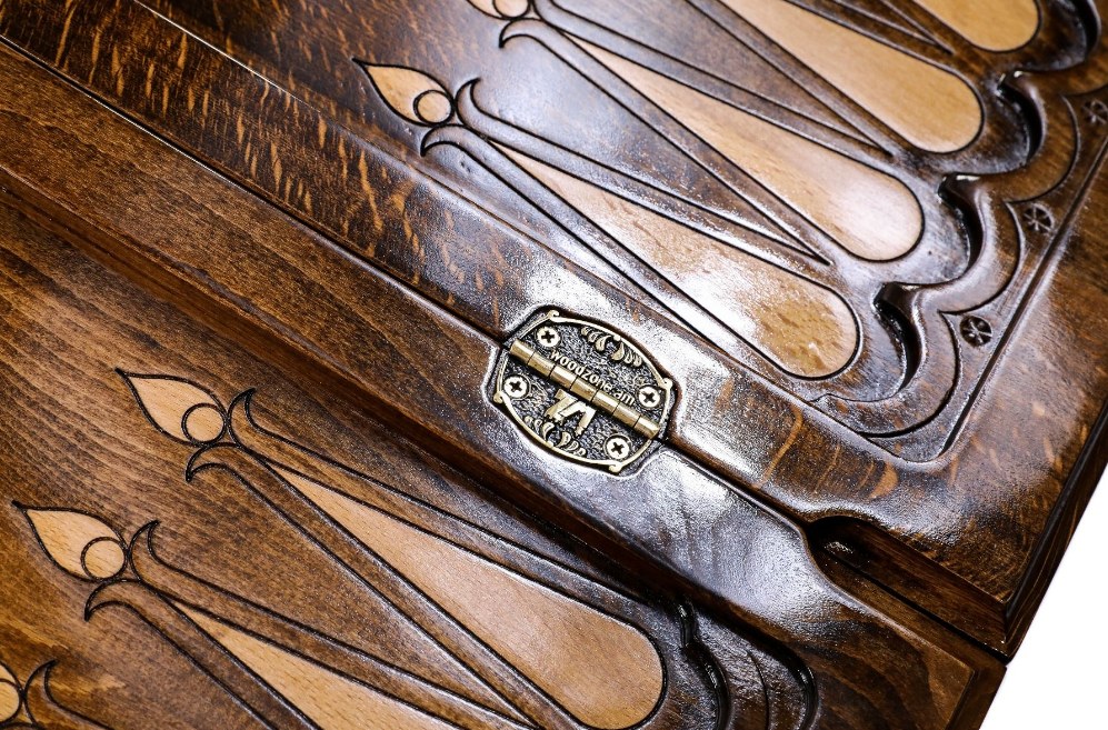 -Игровая доска: техника маркетри + ручная резьба с применением техники объёмной гравировки. Литьё из бронзы (замки и петли)