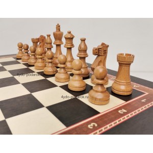 Шахматный ларец выполнен из массива мореного дуба, а его игровое поле покрыто шпоном различных ценных пород дерева (красное дерево, американский орех, клён). Никакой цветной печати - каждый элемент доски, будь то клетка, цифры или буквы, а также поля выполнены в технике маркетри (ручной набор композиции шпоном контрастных пород).