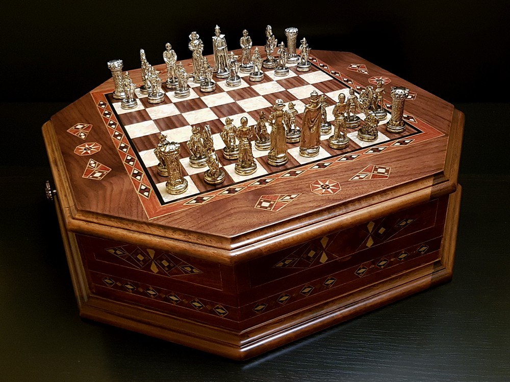 Шахматы "Бастион" орех антик - элитный подарочный шахматный набор VIP класса. Выполнен в виде восточного ларца восьмиугольной формы. Доска-ларец имеет два выдвигающихся ящичка для фигур. Шахматные фигуры отлиты из бронзы и имеют высокую детализацию, представлены в виде средневековых персонажей.