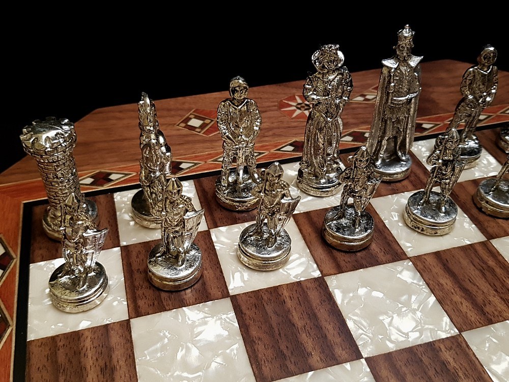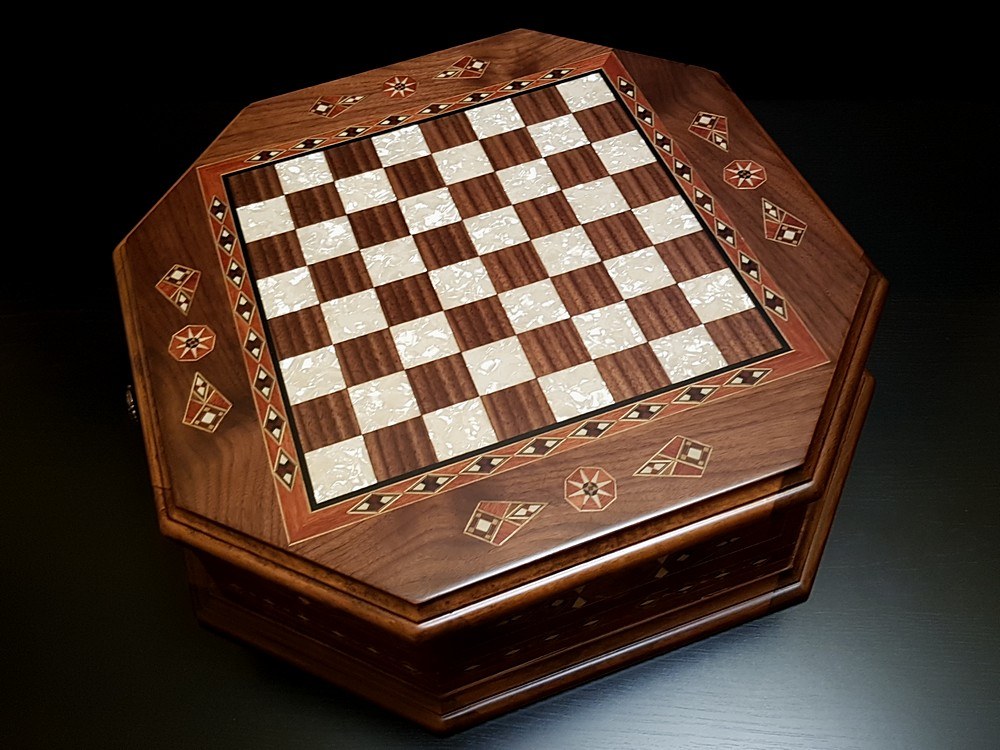 Ручная работа высочайшего качества. Шахматная доска выполнена из ореха и отделана шпоном розы, ореха и других пород, инкрустирована вставками из различных пород дерева и перламутра. Поверхность отполирована и покрыта матовым лаком в стиле "антик"