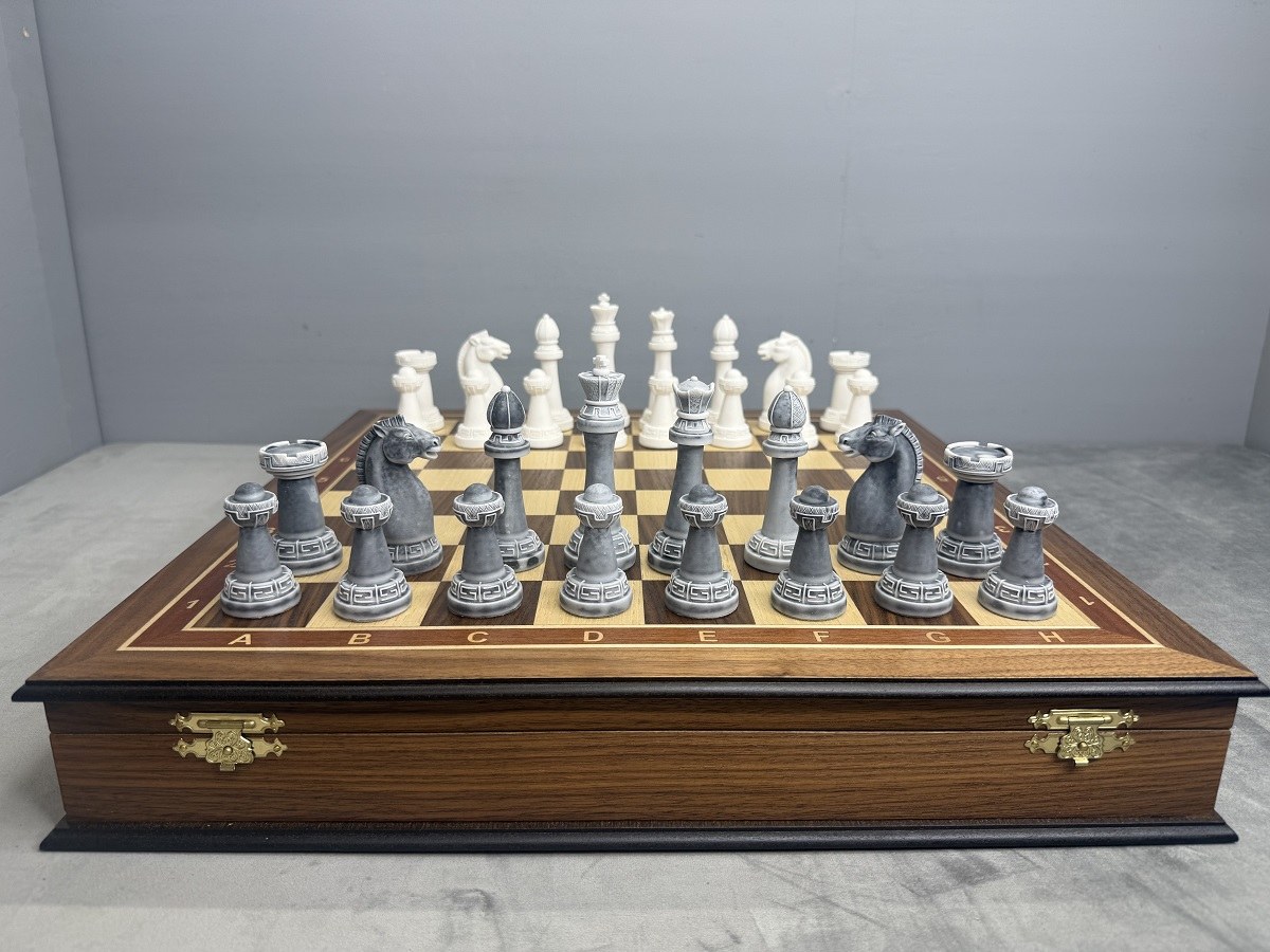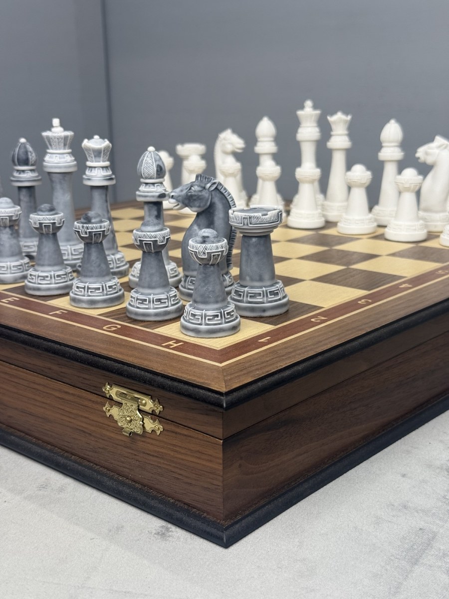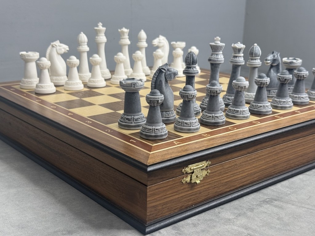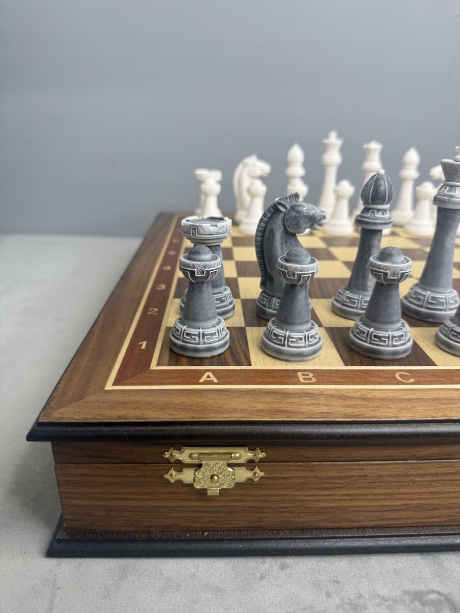 Техника выполнения и обработки ларца: шахматный ларец выполнен из ценных пород дерева с применением техники маркетри. Ларец оснащён декоративны замком из сувенирной стали, а также надёжными петлями, что значительно увеличивает срок эксплуатации произведения мастера. Внутренняя обивка ларца итальянским бархатом с ложементом под каждую фигуру придаёт дополнительное благородство и подчёркивает статус и вкус его обладателя.