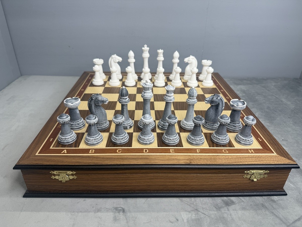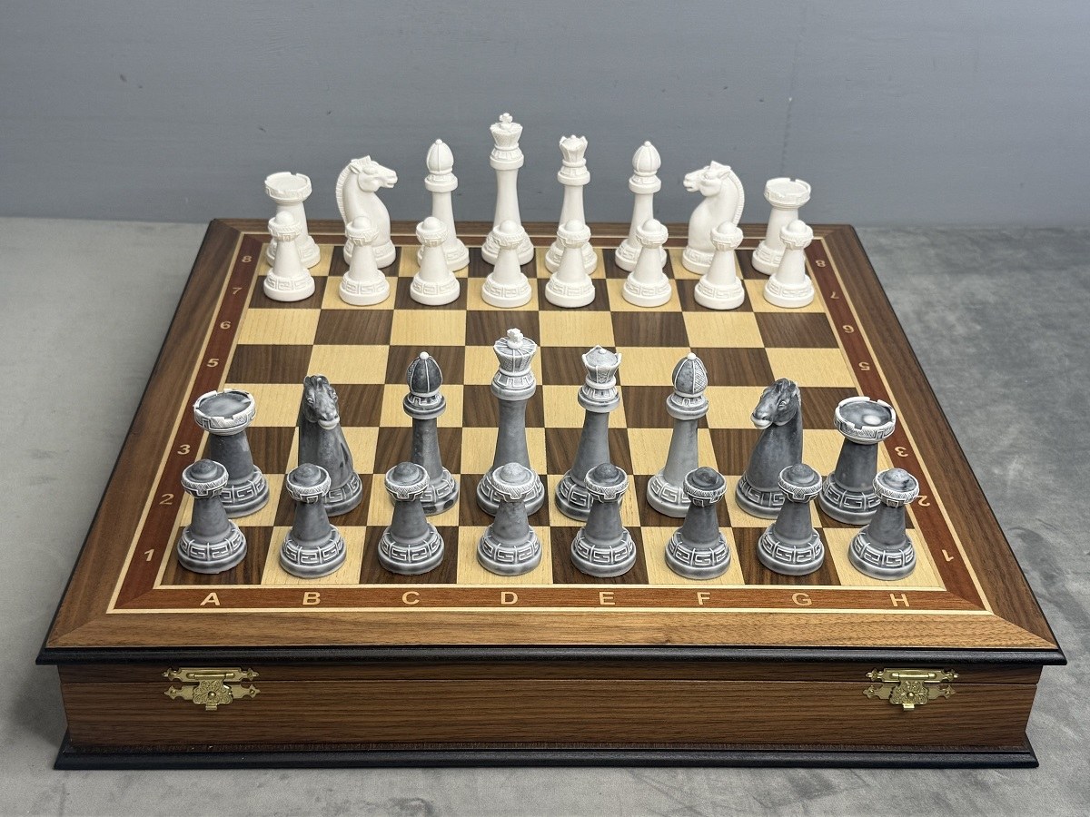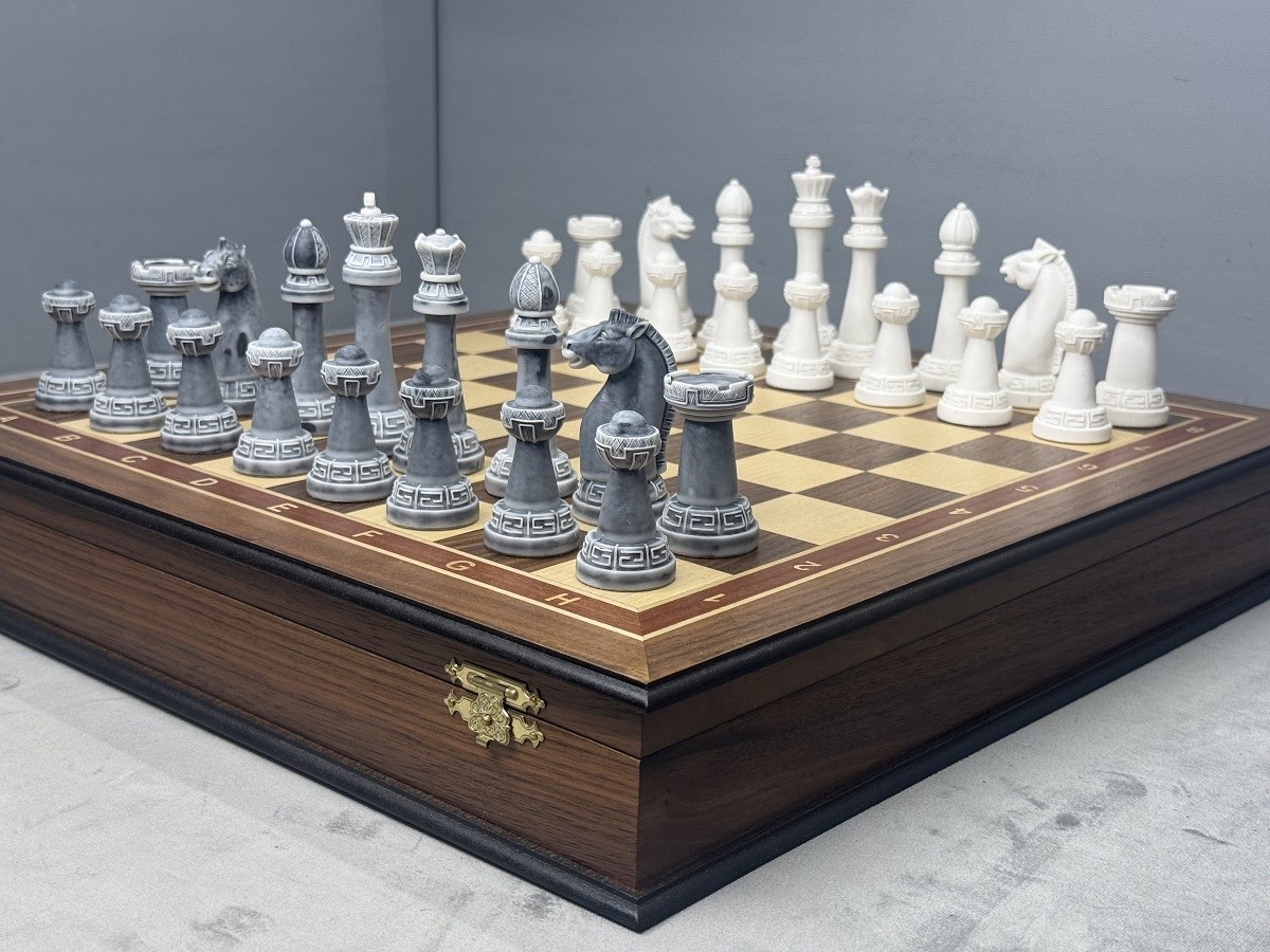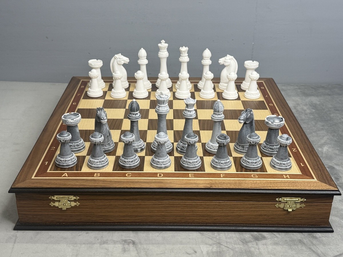 Техника выполнения и обработки ларца: шахматный ларец выполнен из ценных пород дерева с применением техники маркетри. Ларец оснащён декоративны замком из сувенирной стали, а также надёжными петлями, что значительно увеличивает срок эксплуатации произведения мастера. Внутренняя обивка ларца итальянским бархатом с ложементом под каждую фигуру придаёт дополнительное благородство и подчёркивает статус и вкус его обладателя.