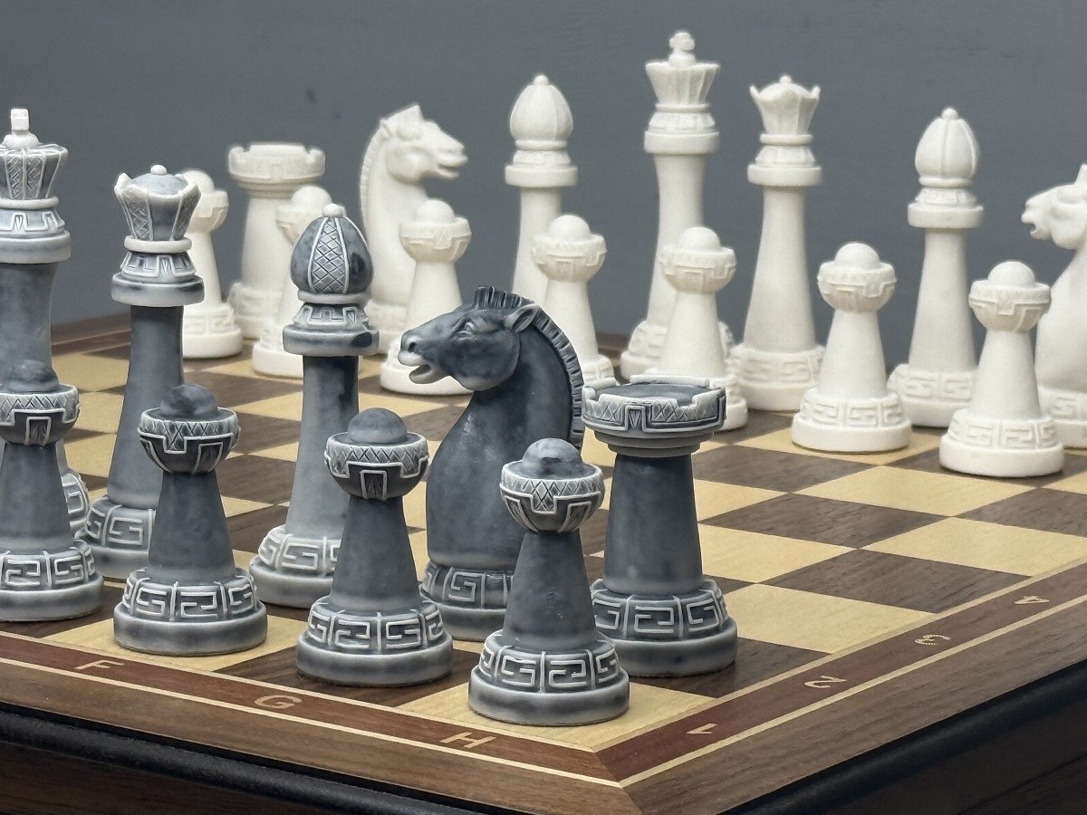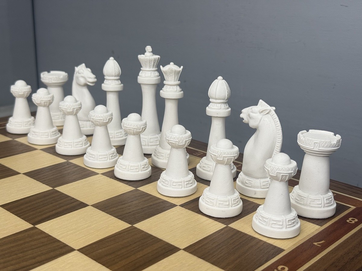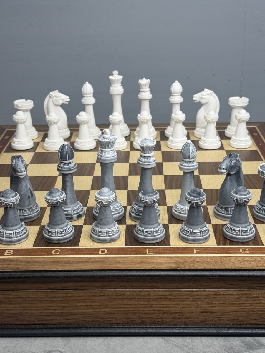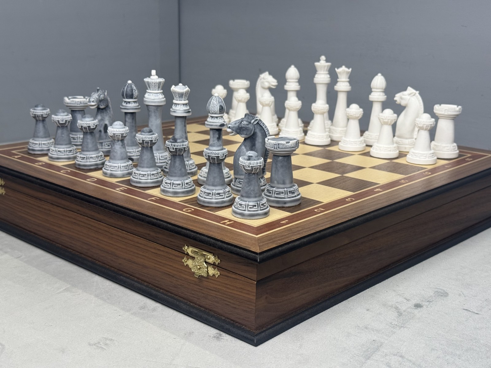 Техника выполнения и обработки ларца: шахматный ларец выполнен из ценных пород дерева с применением техники маркетри. Ларец оснащён декоративны замком из сувенирной стали, а также надёжными петлями, что значительно увеличивает срок эксплуатации произведения мастера. Внутренняя обивка ларца итальянским бархатом с ложементом под каждую фигуру придаёт дополнительное благородство и подчёркивает статус и вкус его обладателя.