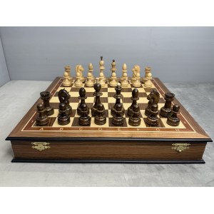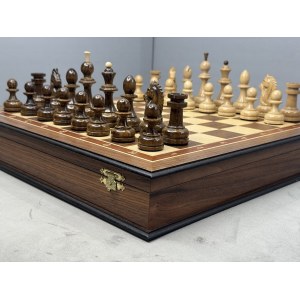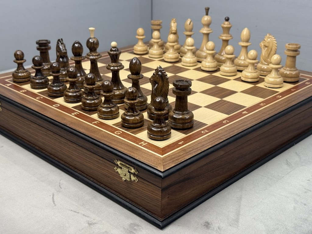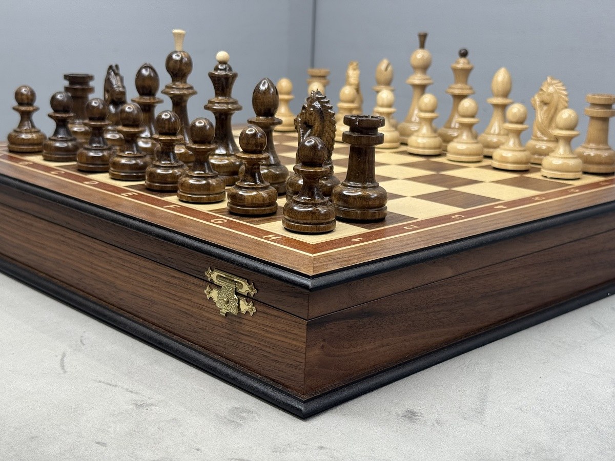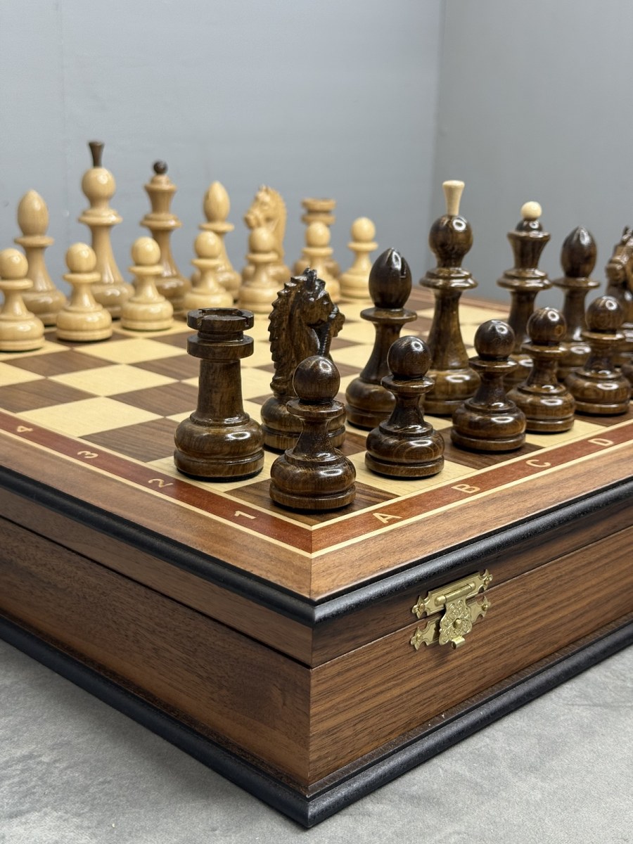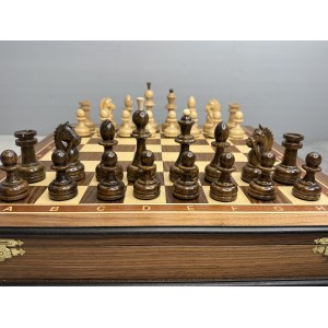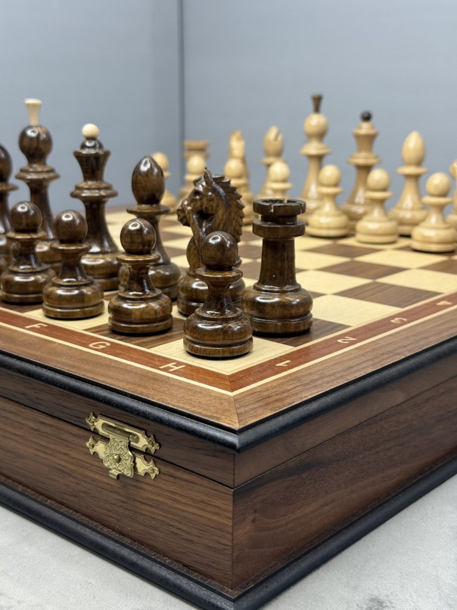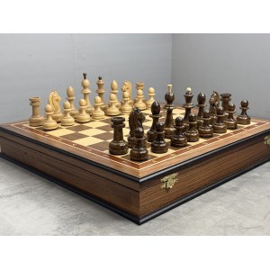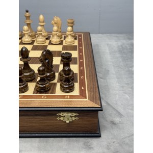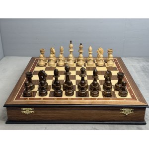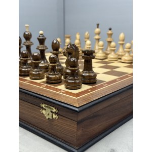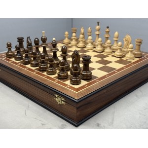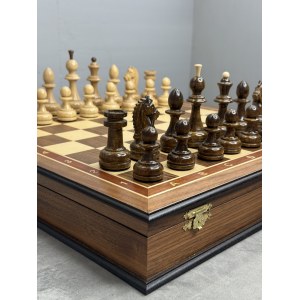 Техника выполнения и обработки ларца: шахматный ларец выполнен из ценных пород дерева с применением техники маркетри. Ларец оснащён декоративны замком из сувенирной стали, а также надёжными петлями, что значительно увеличивает срок эксплуатации произведения мастера. Внутренняя обивка ларца итальянским бархатом с ложементом под каждую фигуру придаёт дополнительное благородство и подчёркивает статус и вкус его обладателя.