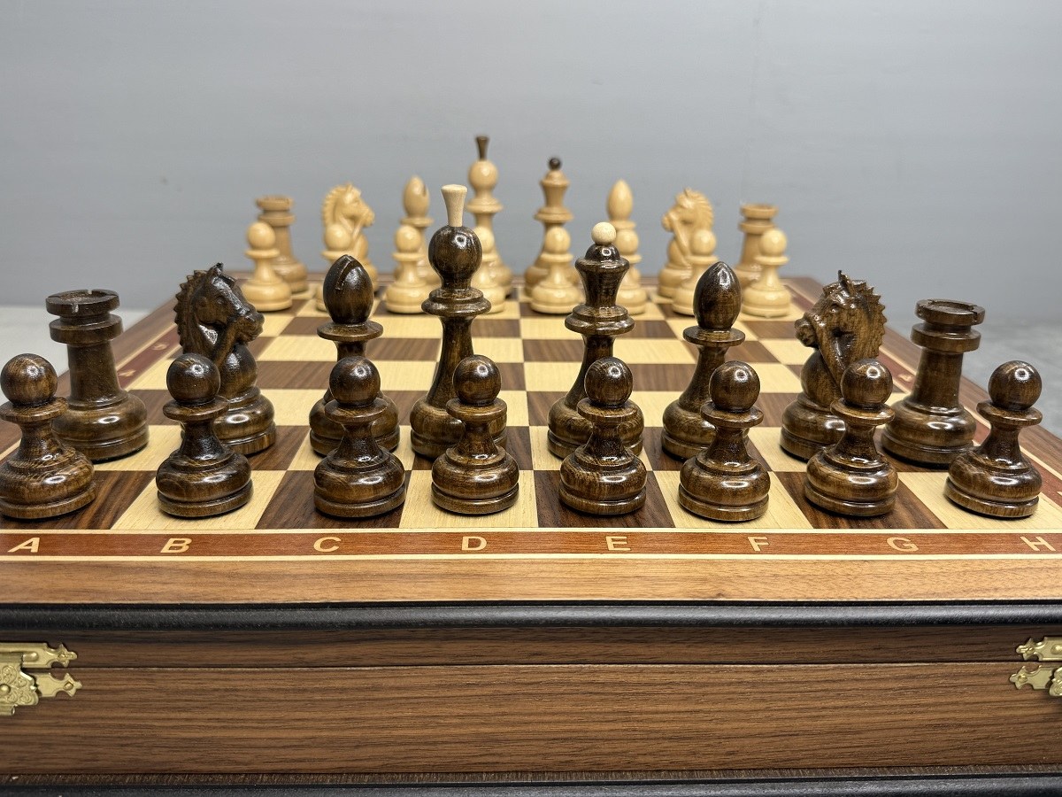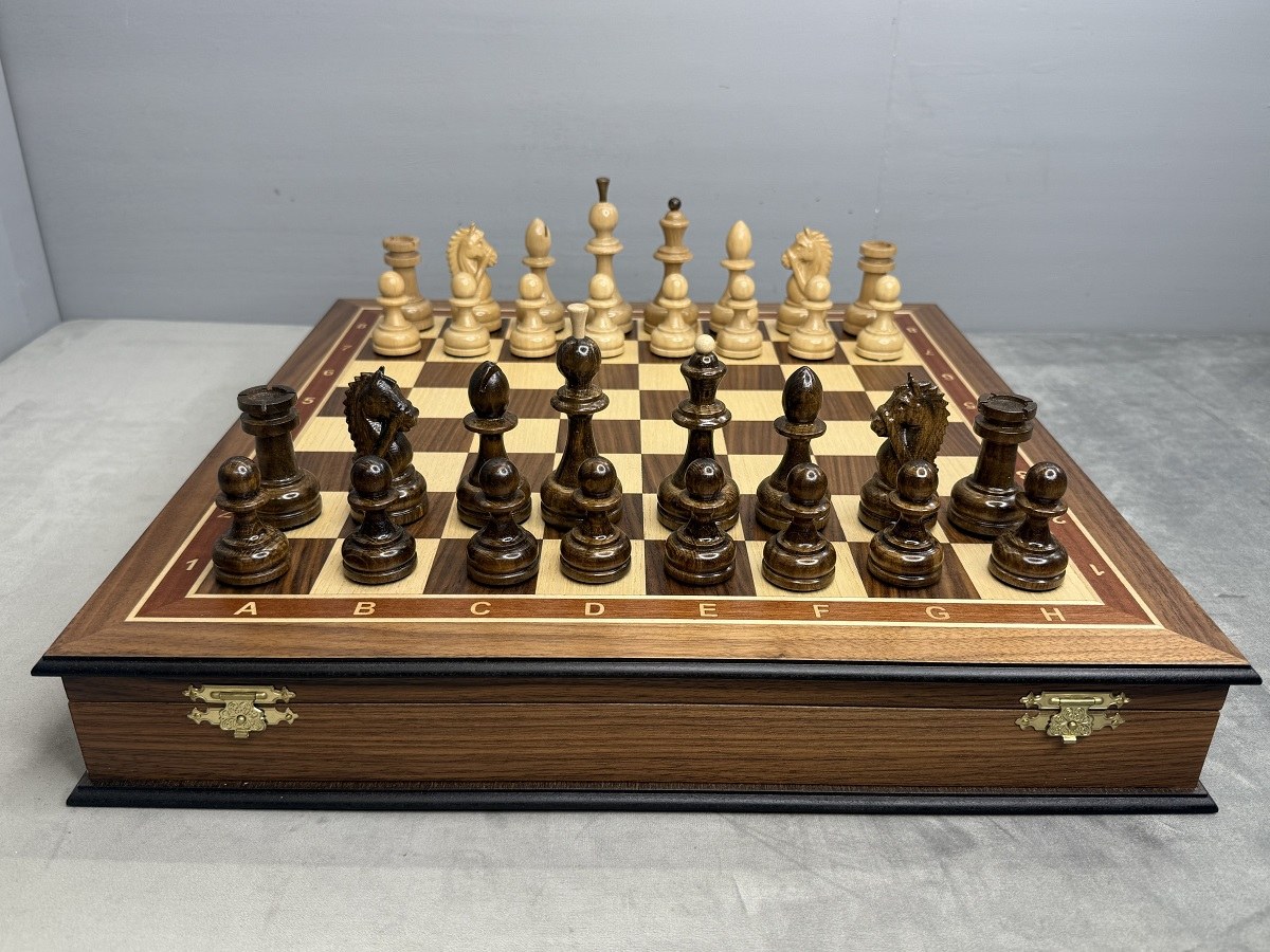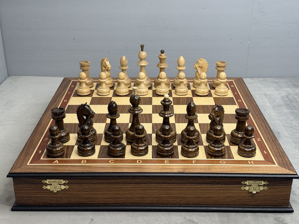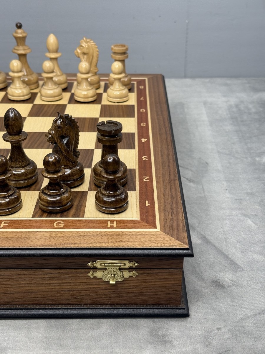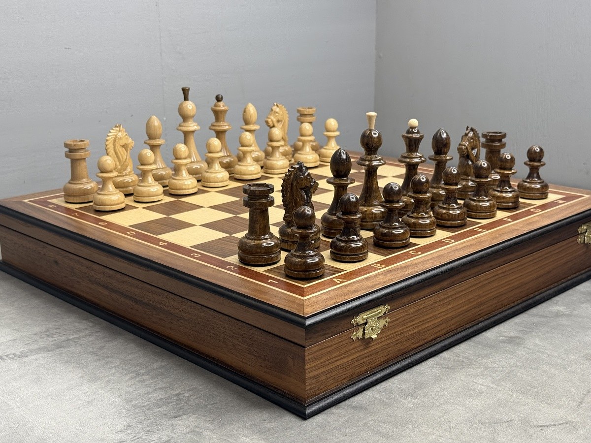Техника выполнения и обработки ларца: шахматный ларец выполнен из ценных пород дерева с применением техники маркетри. Ларец оснащён декоративны замком из сувенирной стали, а также надёжными петлями, что значительно увеличивает срок эксплуатации произведения мастера. Внутренняя обивка ларца итальянским бархатом с ложементом под каждую фигуру придаёт дополнительное благородство и подчёркивает статус и вкус его обладателя.