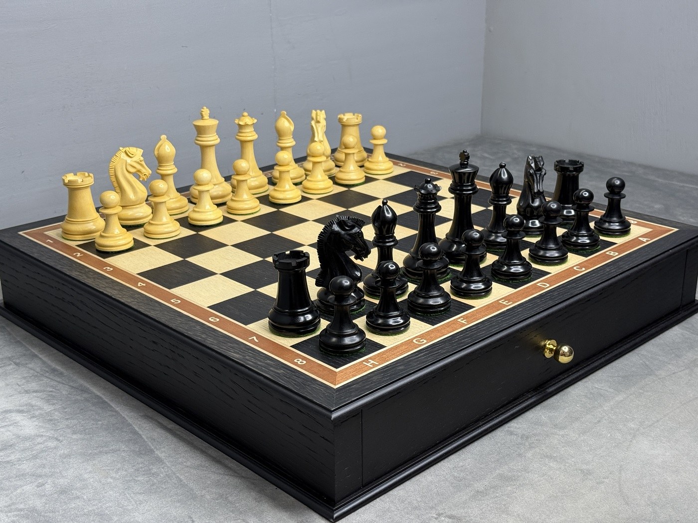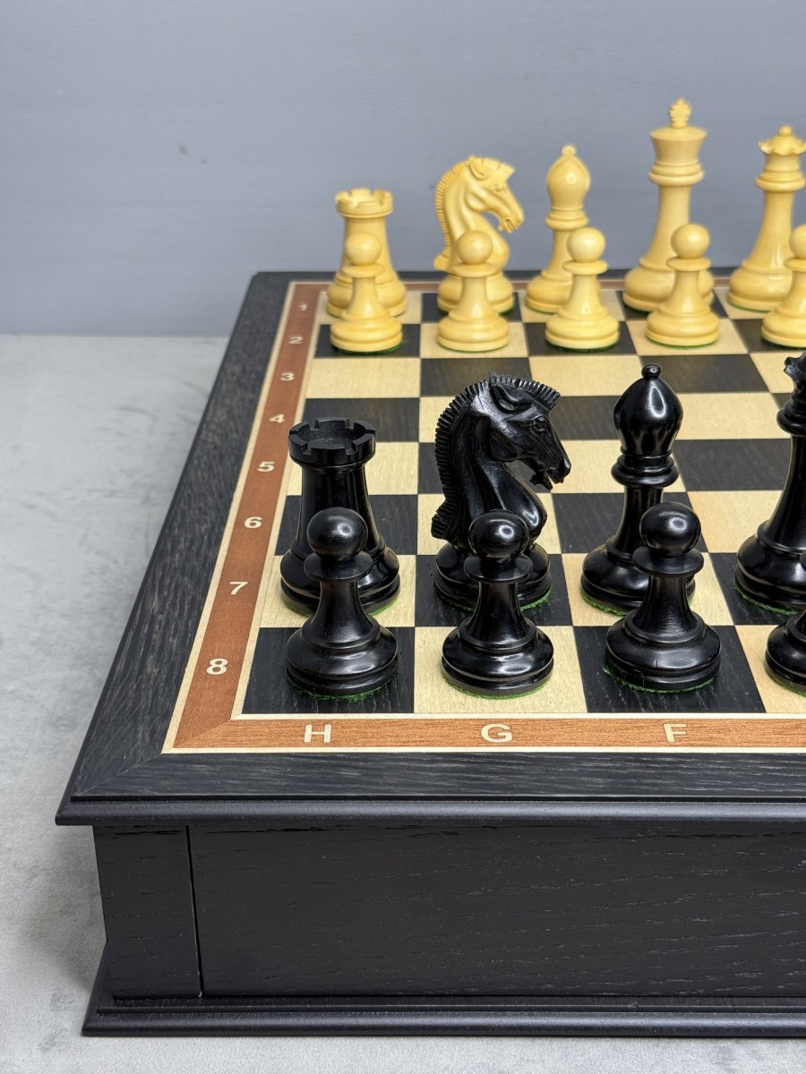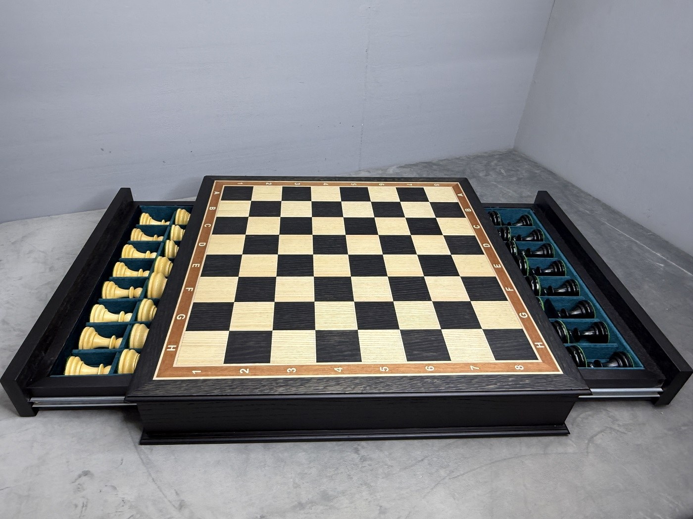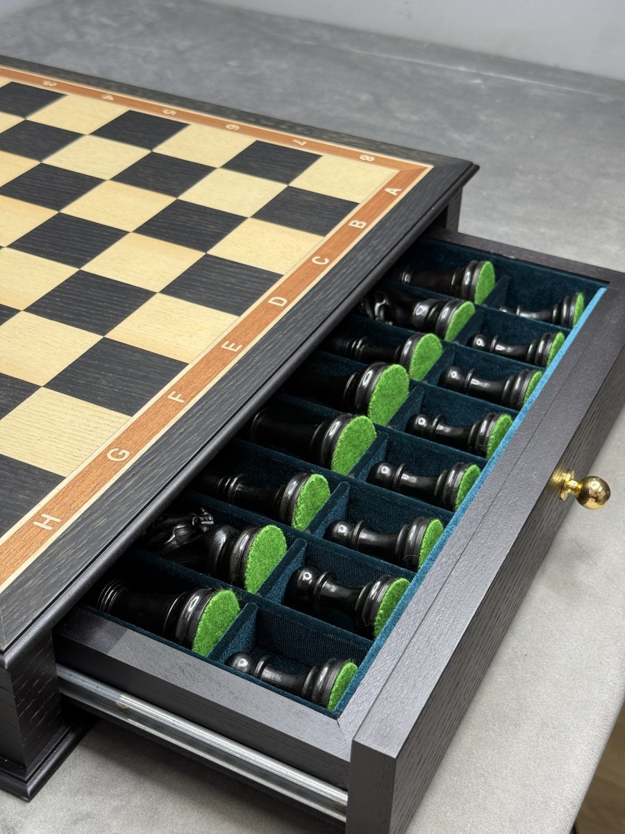 Шахматы из массива мореного дуба,ореха и красного дерева выполнена в технике маркетри(ручная работа), размер 48 на 48 см,клетка 5 на 5 см,выдвижные ящики с двух сторон для хранения фигур.