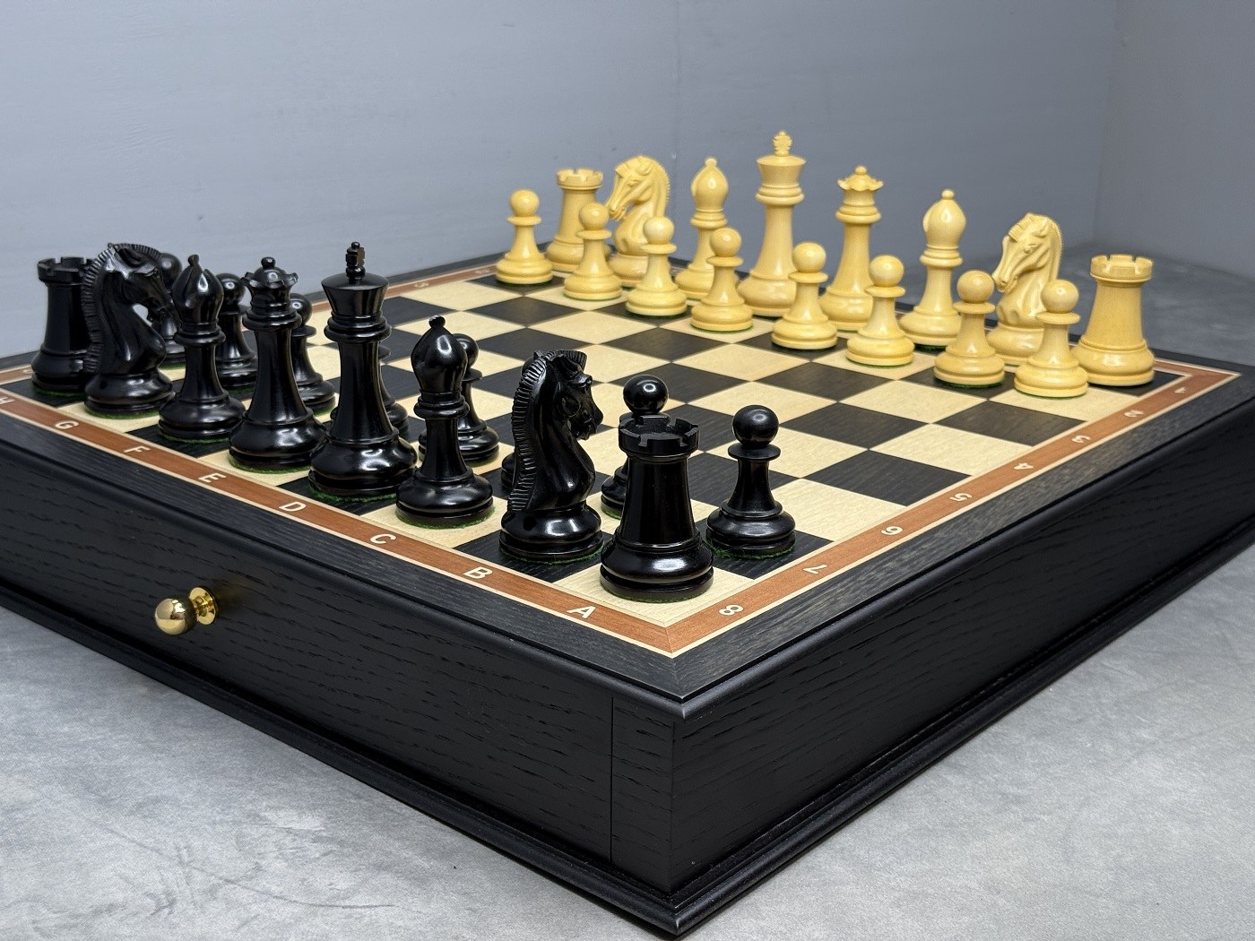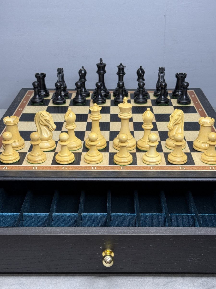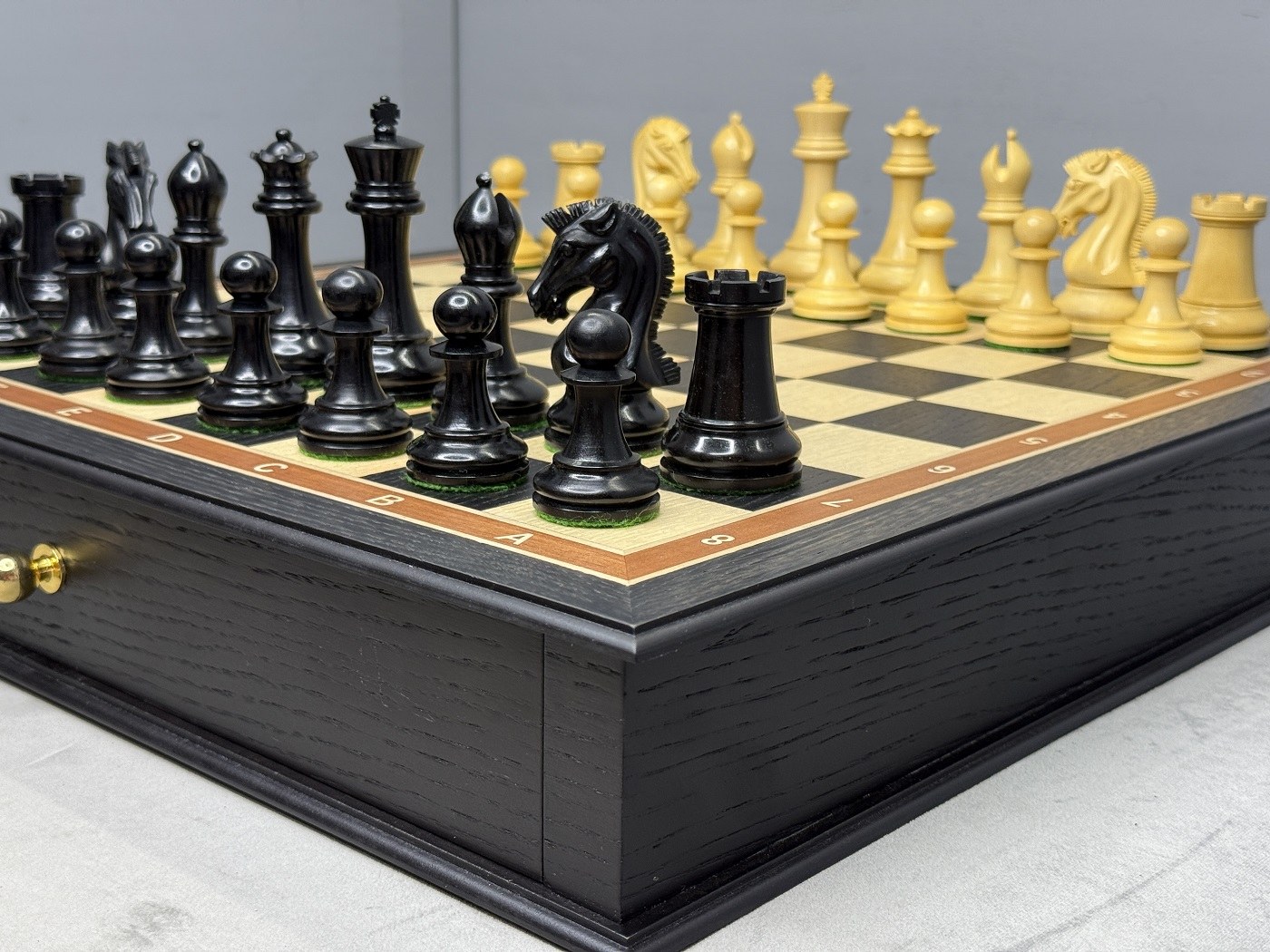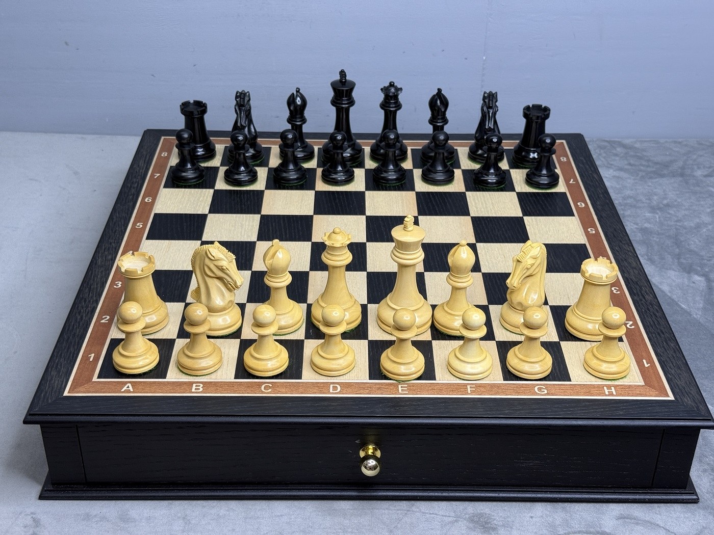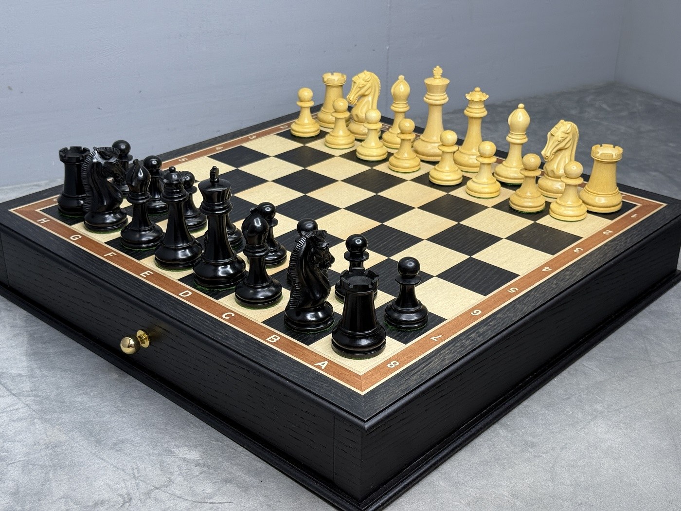 Шахматы из массива мореного дуба,ореха и красного дерева выполнена в технике маркетри(ручная работа), размер 48 на 48 см,клетка 5 на 5 см,выдвижные ящики с двух сторон для хранения фигур.