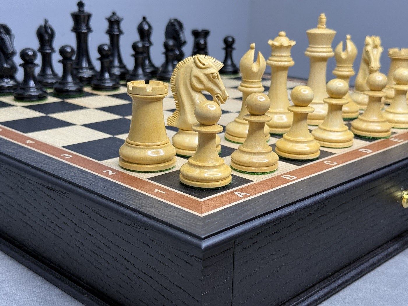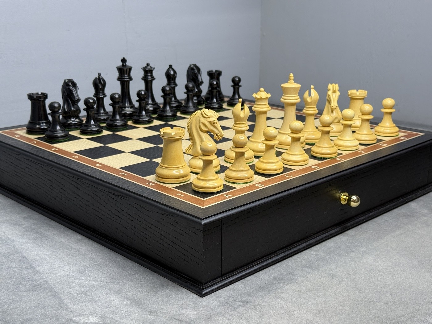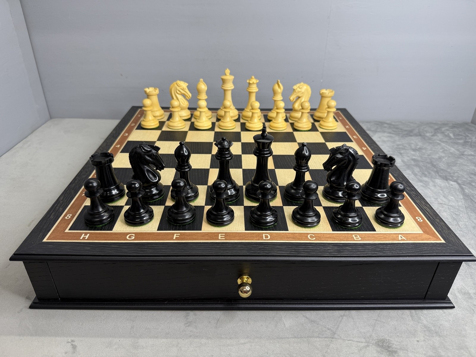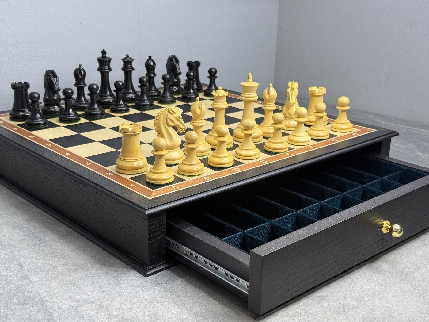 Шахматы из массива мореного дуба,ореха и красного дерева выполнена в технике маркетри(ручная работа), размер 48 на 48 см,клетка 5 на 5 см,выдвижные ящики с двух сторон для хранения фигур.