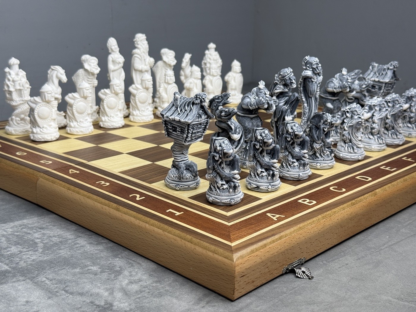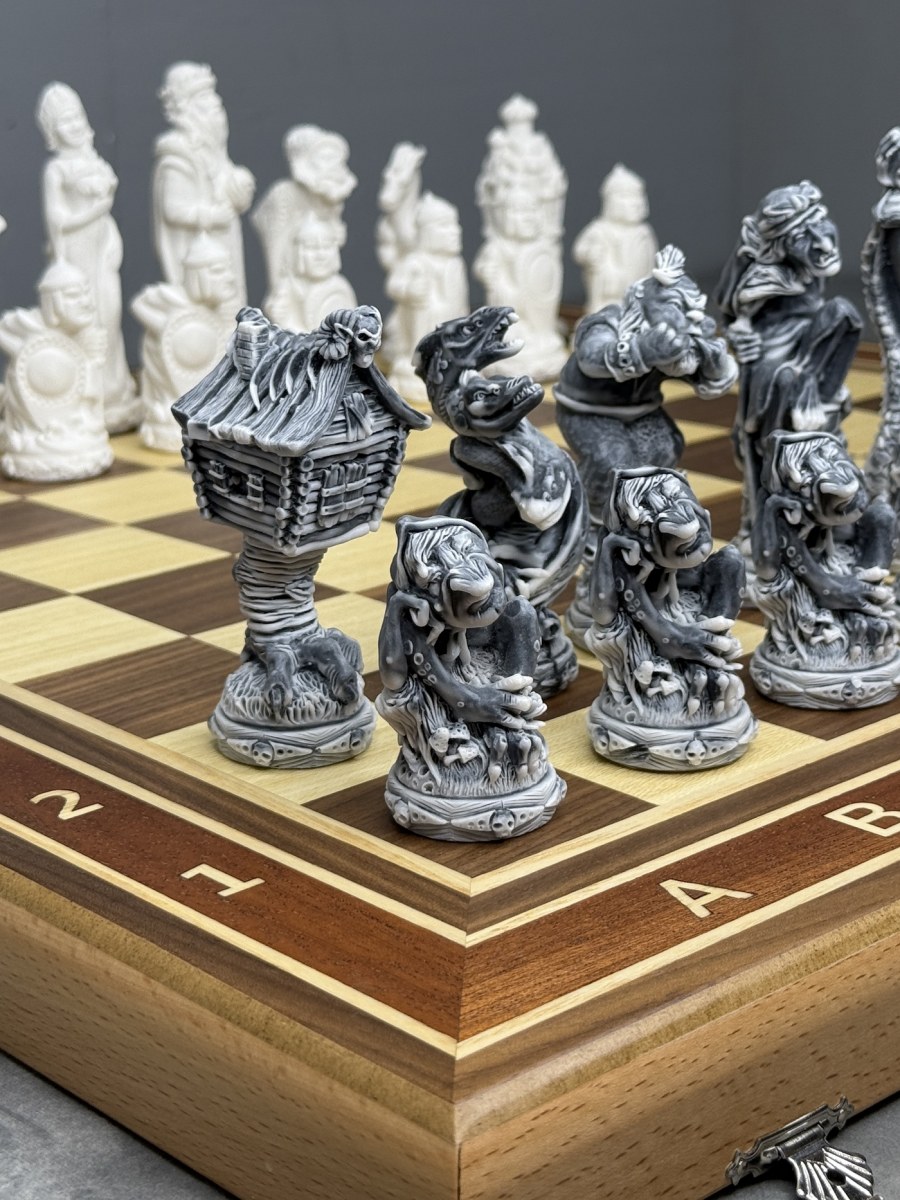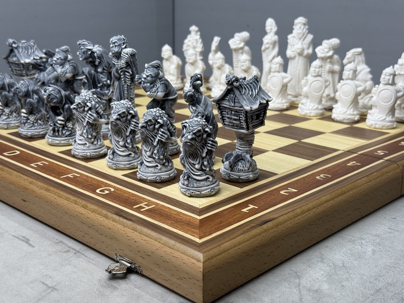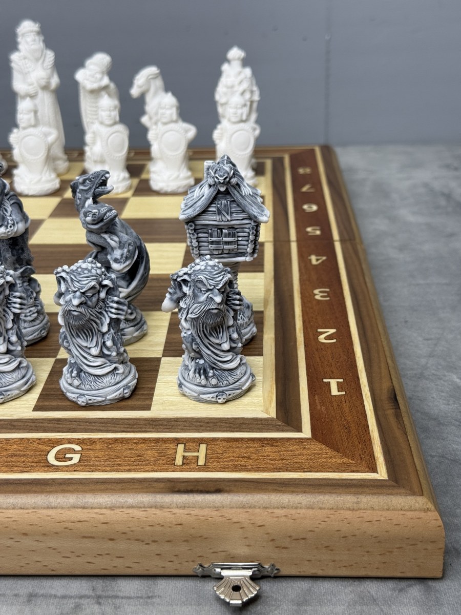 Шахматная доска выполнена в технике маркетри с использованием шпона ореха и ясеня.