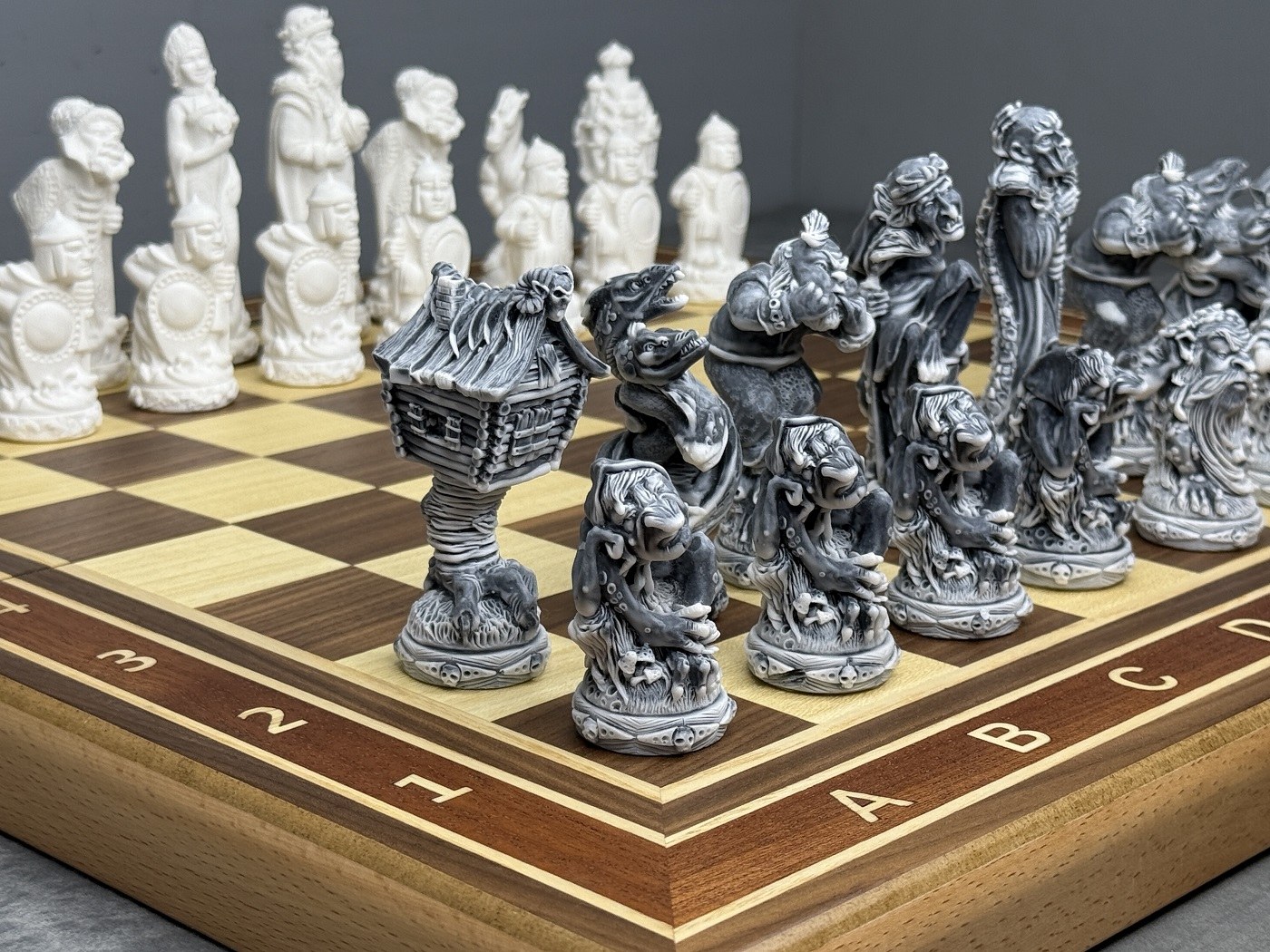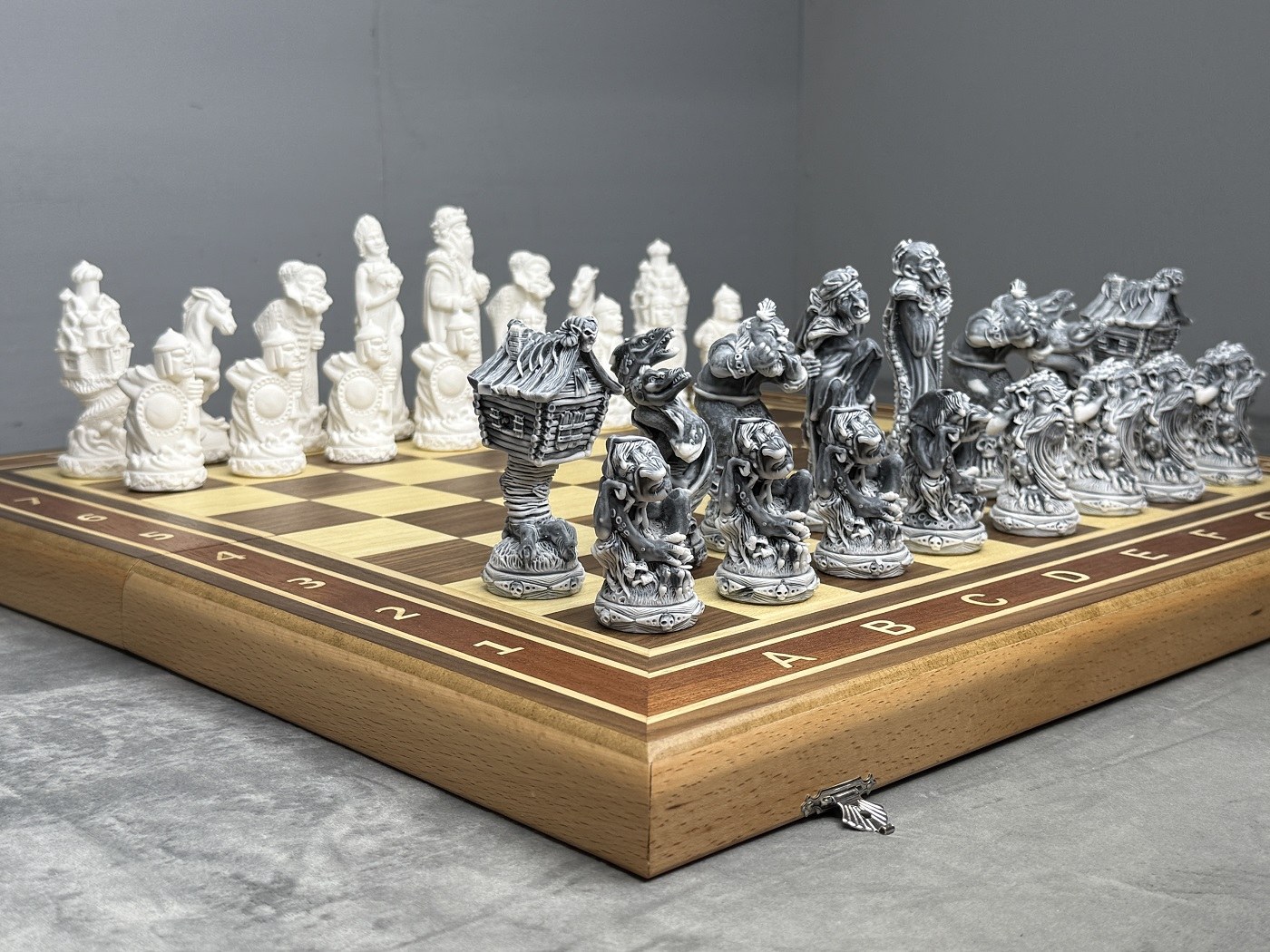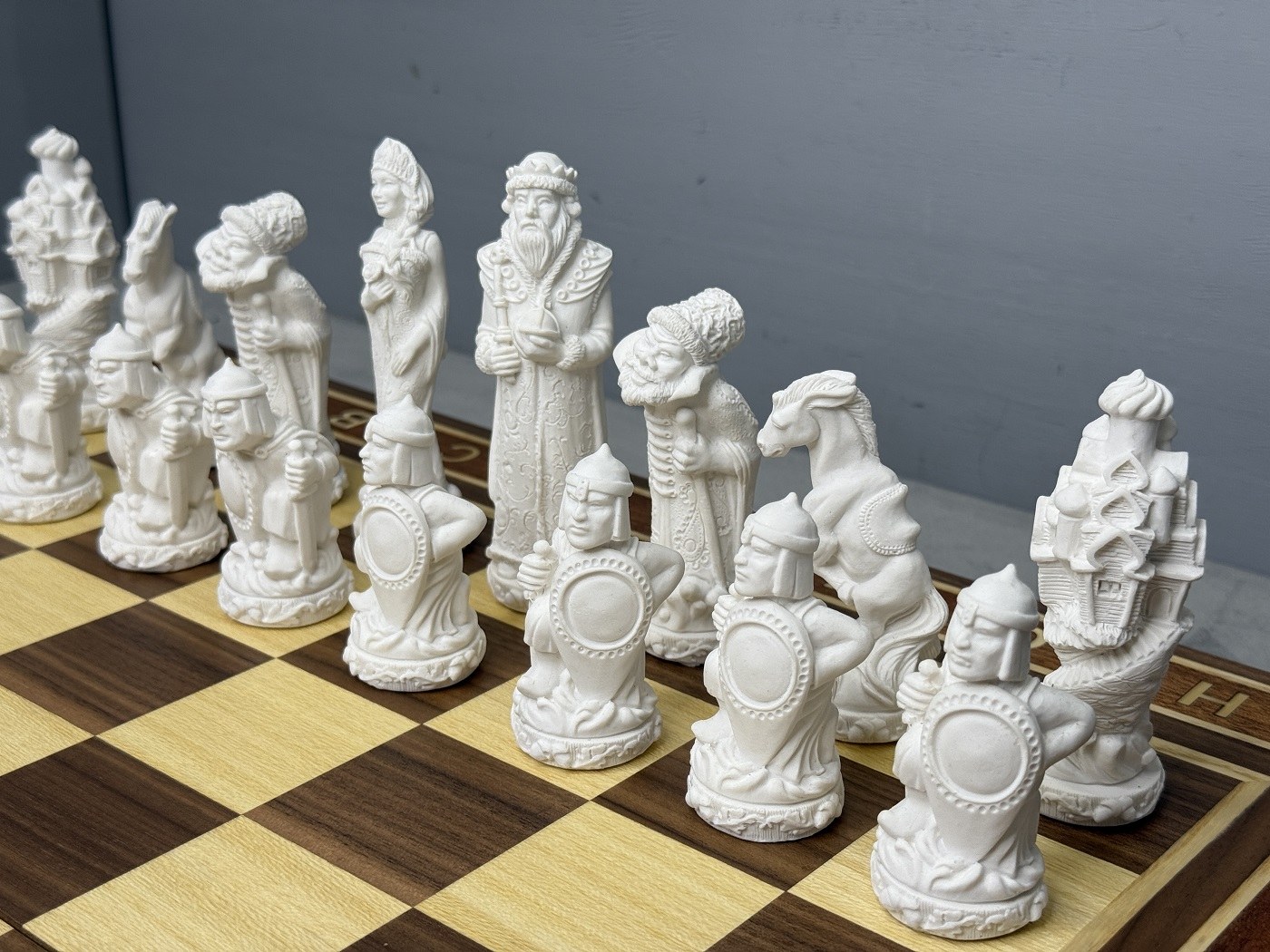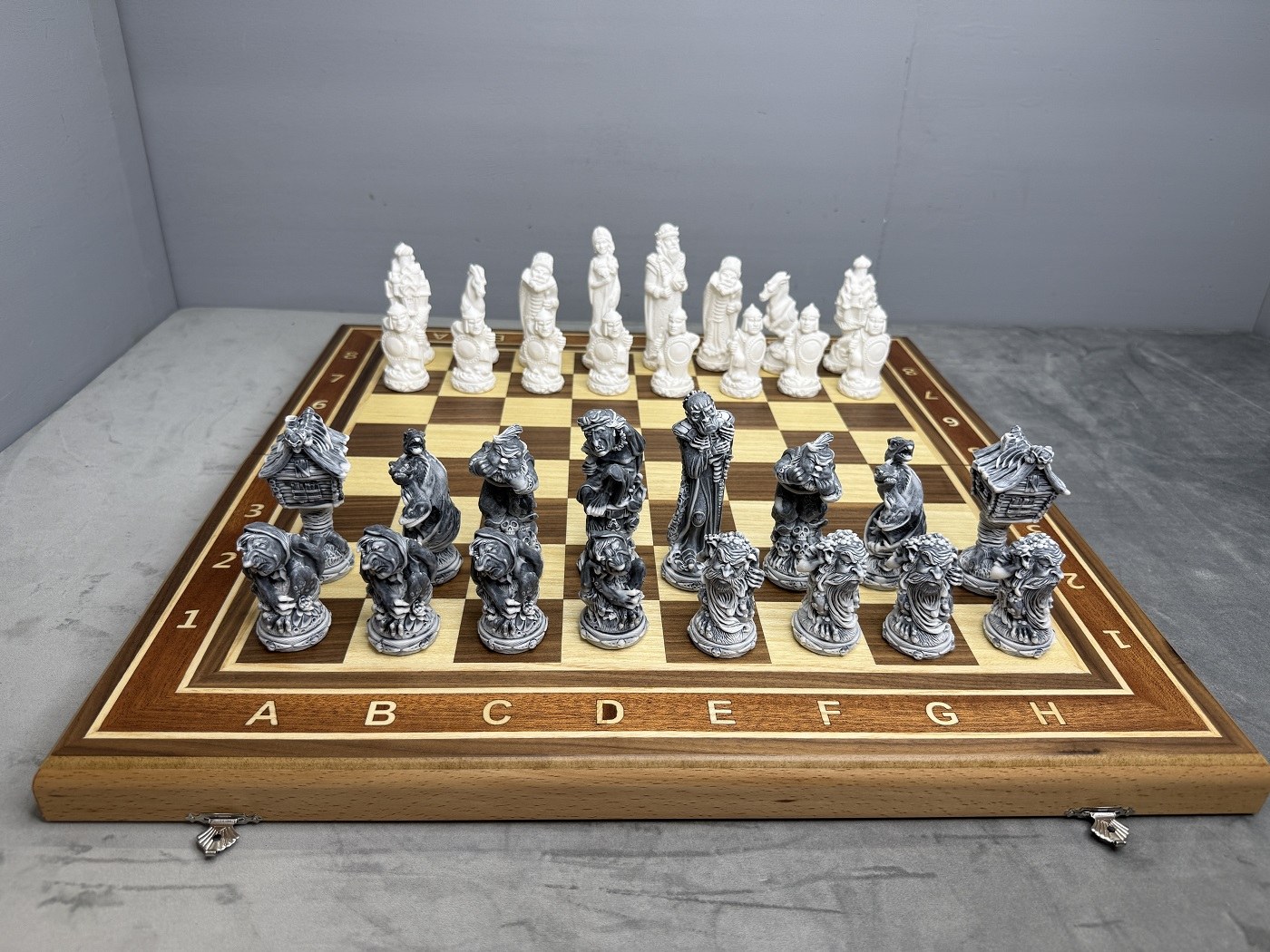 Шахматная доска выполнена в технике маркетри с использованием шпона ореха и ясеня.