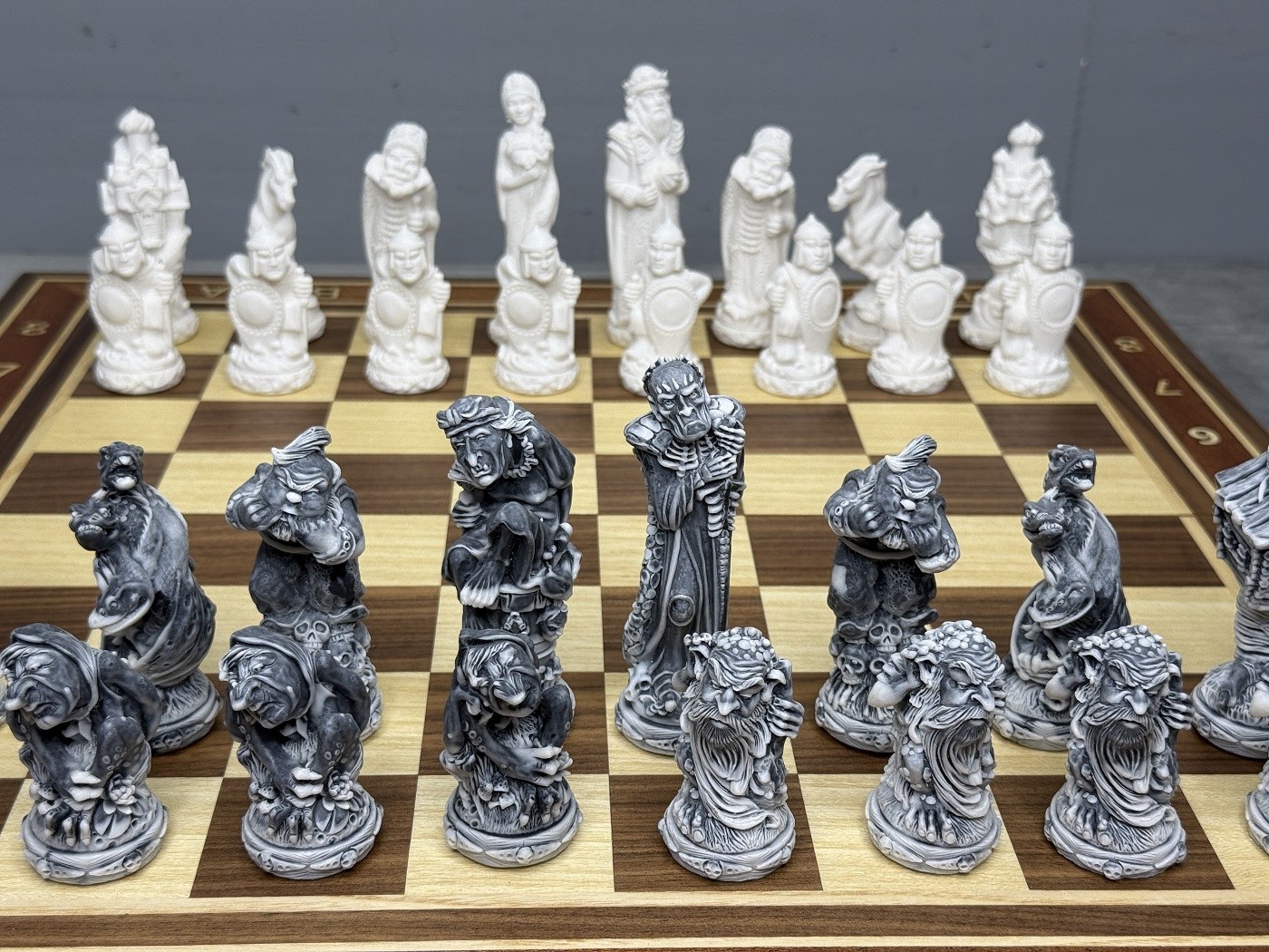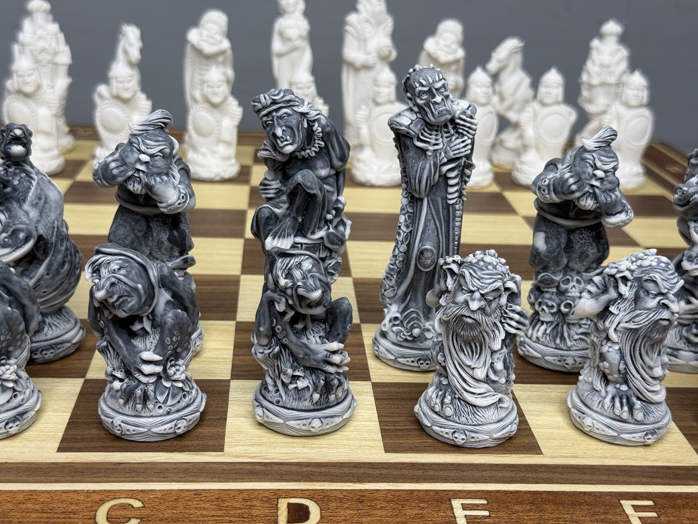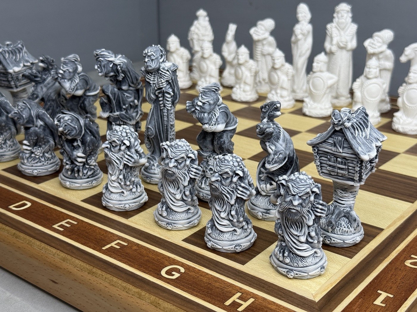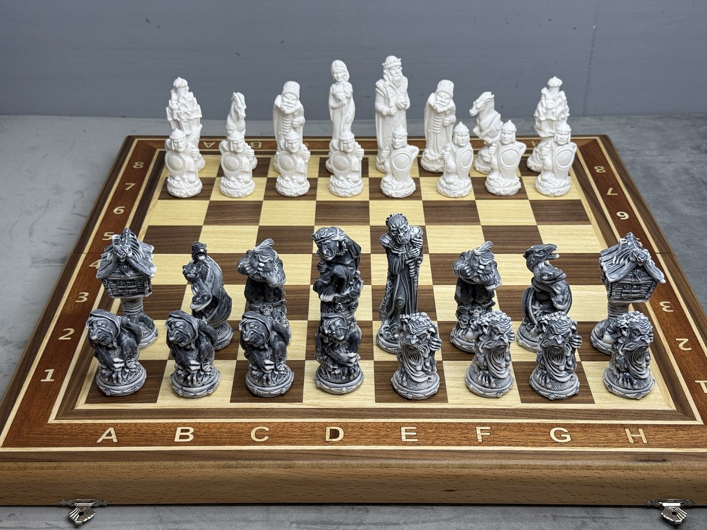 Шахматная доска выполнена в технике маркетри с использованием шпона ореха и ясеня.