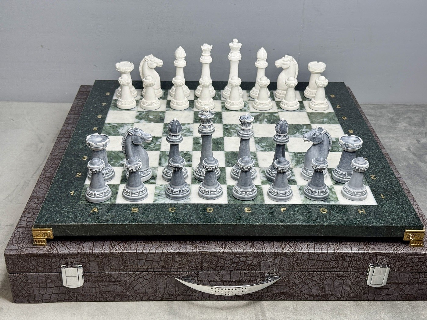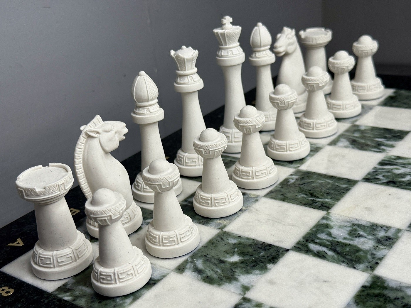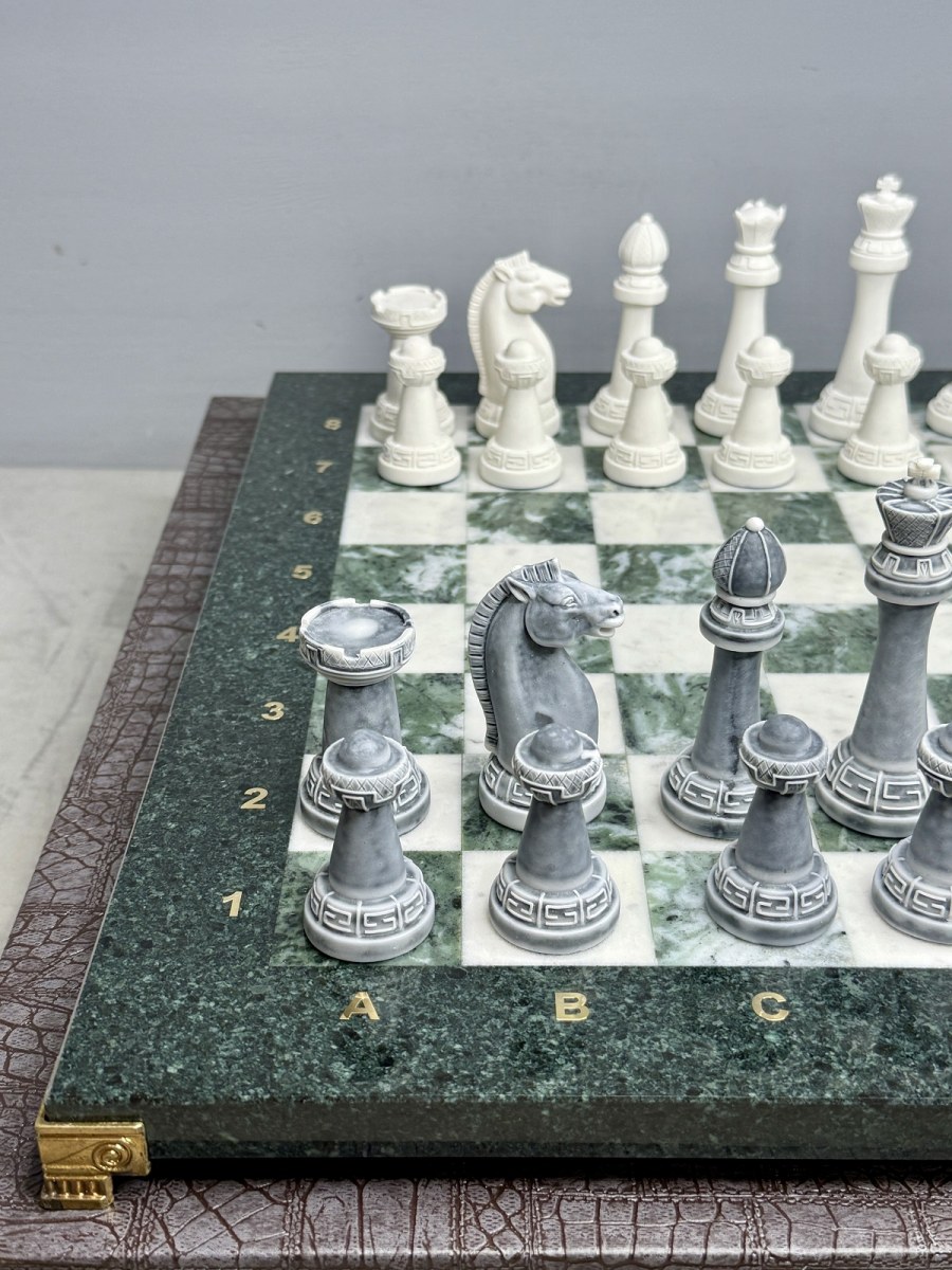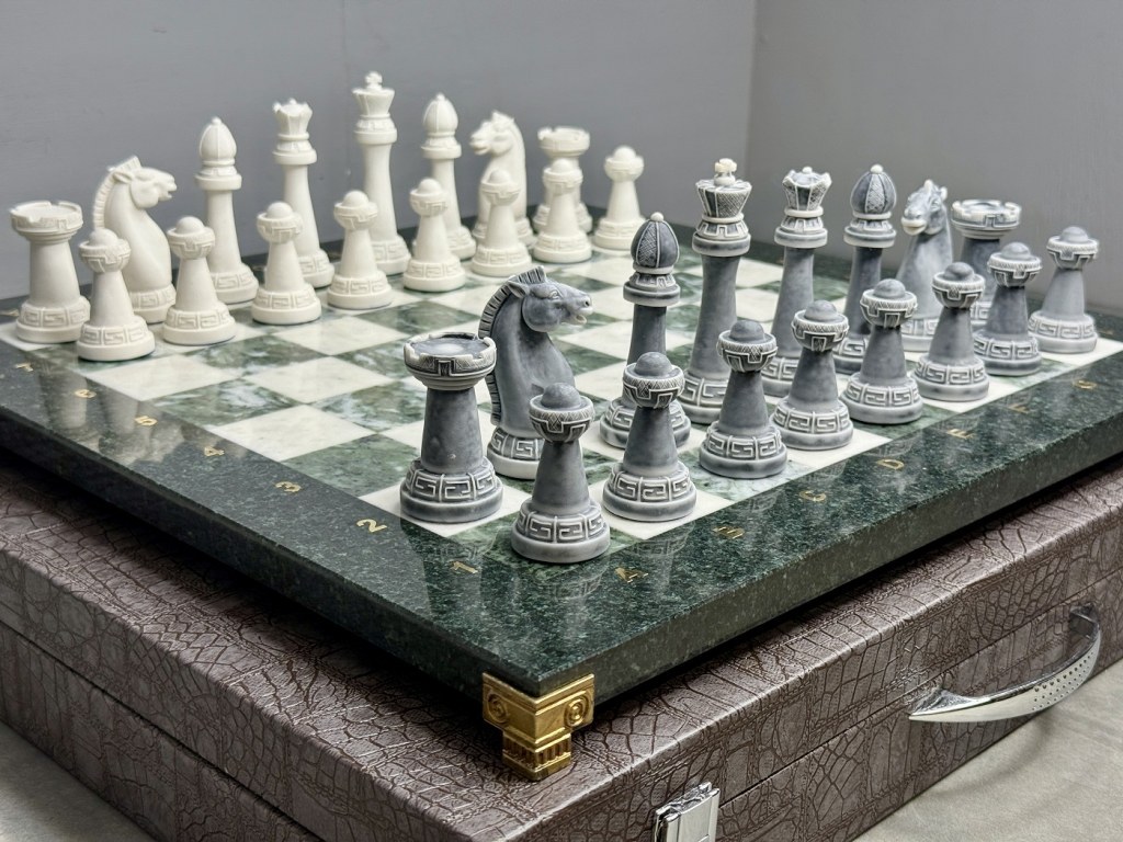 Набор для игры в шахматы изготовлен вручную, доска нескладная из натурального камня, шахматные фигуры из искусственного мрамора.