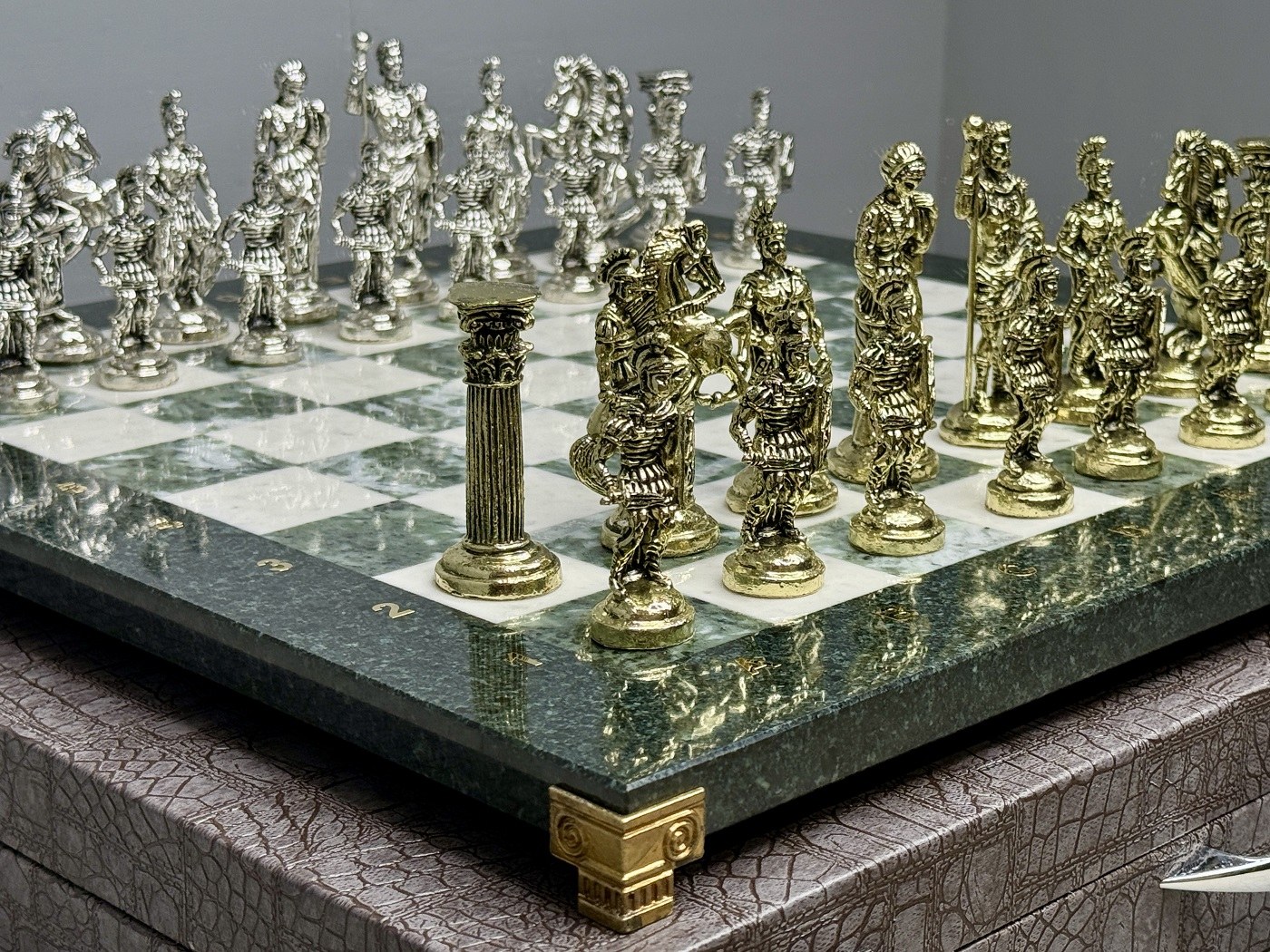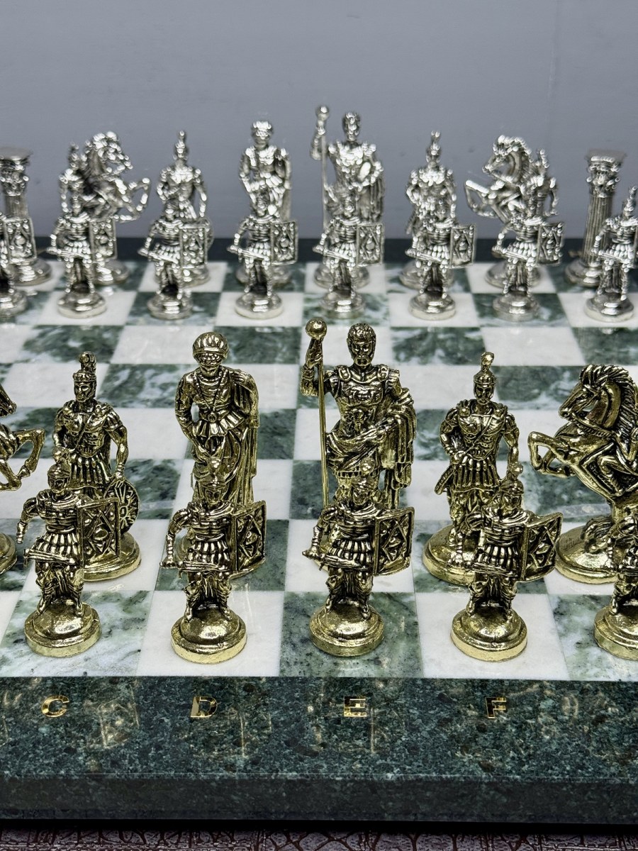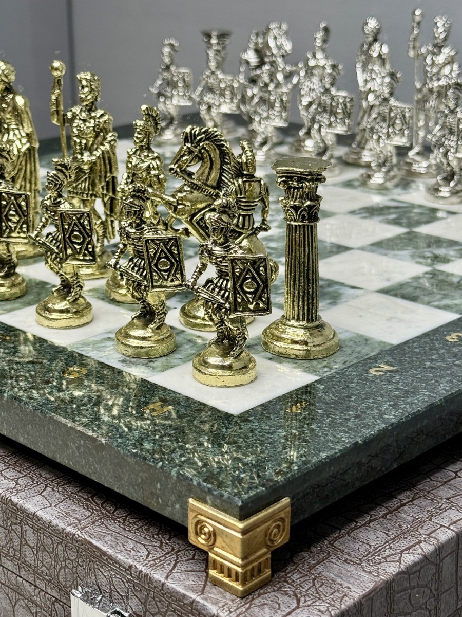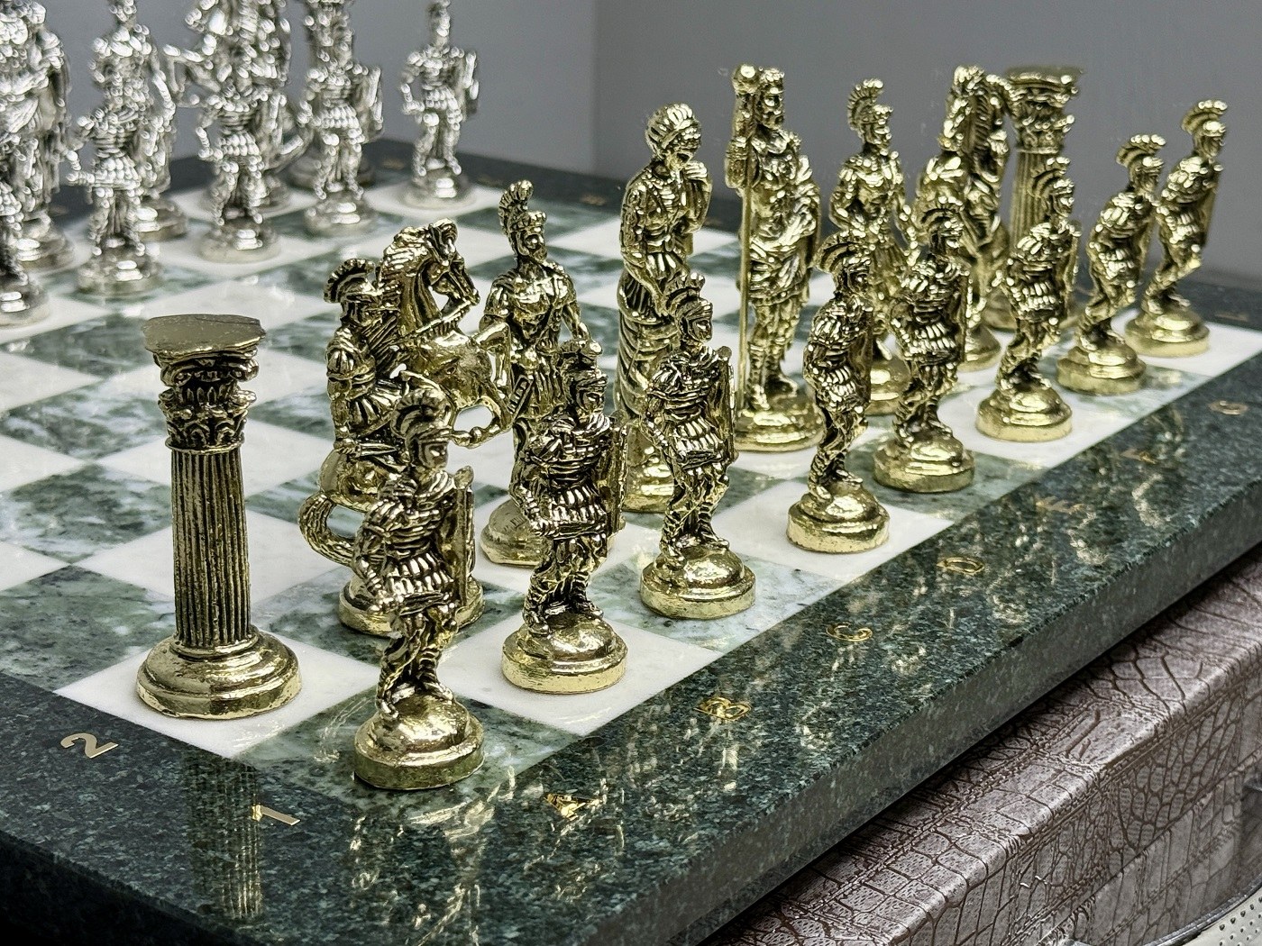 Шахматы изготовлены вручную из натурального камня, каждое изделие имеет индивидуальный оттенок и рисунок. Допускается наличие естественных прожилок в камне, размеры могут немного отличаться.