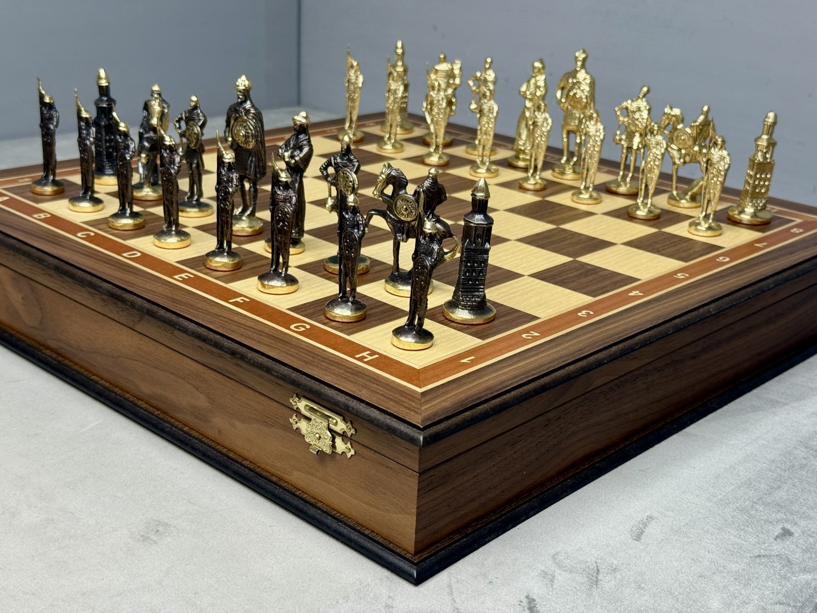 Шахматы в ларце «Русские» — премиальный подарочный набор, созданный для ценителей статусных и коллекционных шахмат. Сочетание натурального дерева благородных пород и тематических бронзовых фигур формирует выразительный и солидный образ.
